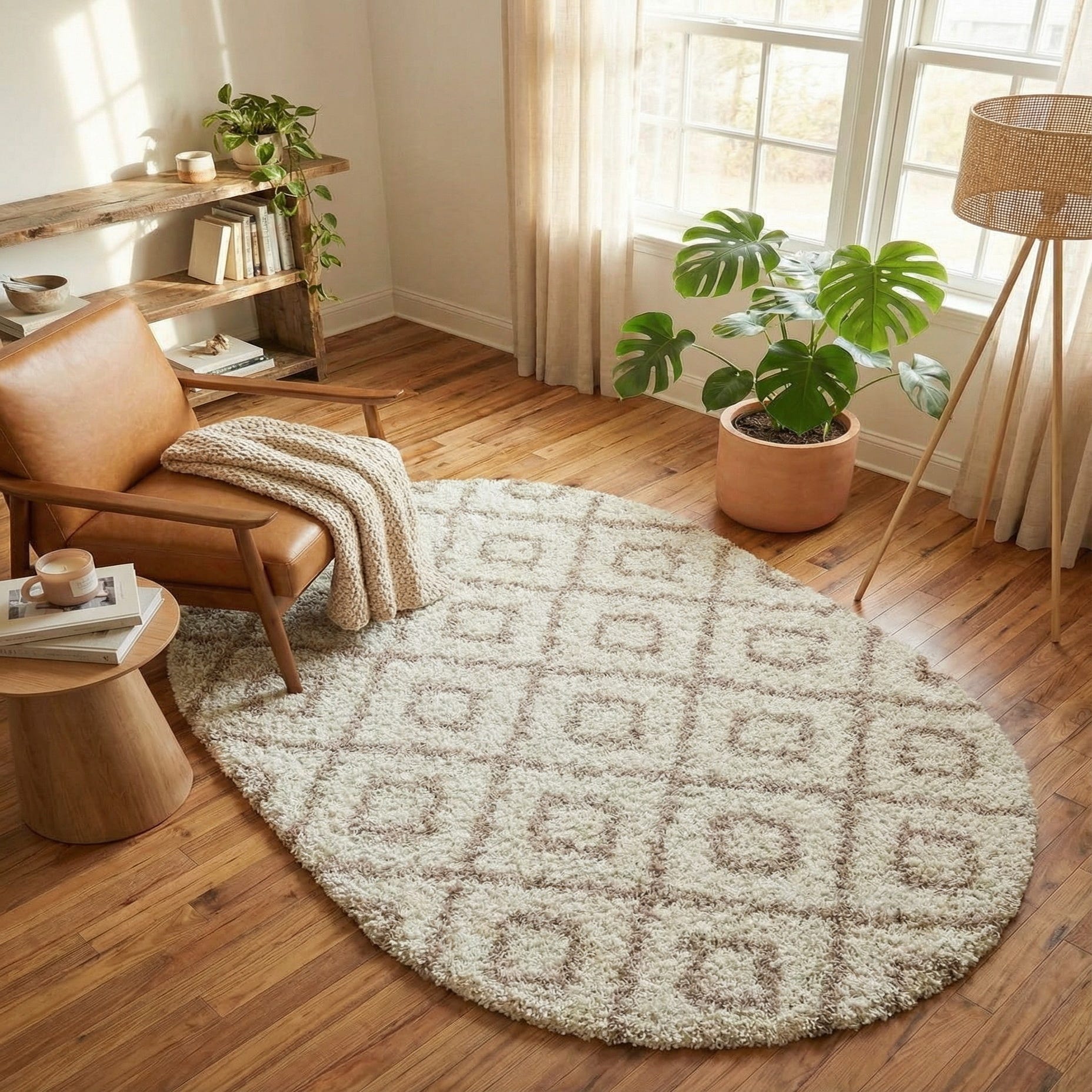 The oval silhouette gently softens angular furniture and works especially well beneath round or curved tables, at the foot of a bed, or layered in a cozy reading nook. Pair it with light woods, linen upholstery, and natural woven accents for a casual Scandinavian or modern farmhouse feel, or place it in a transitional living room to add warmth and pattern without competing with existing decor.