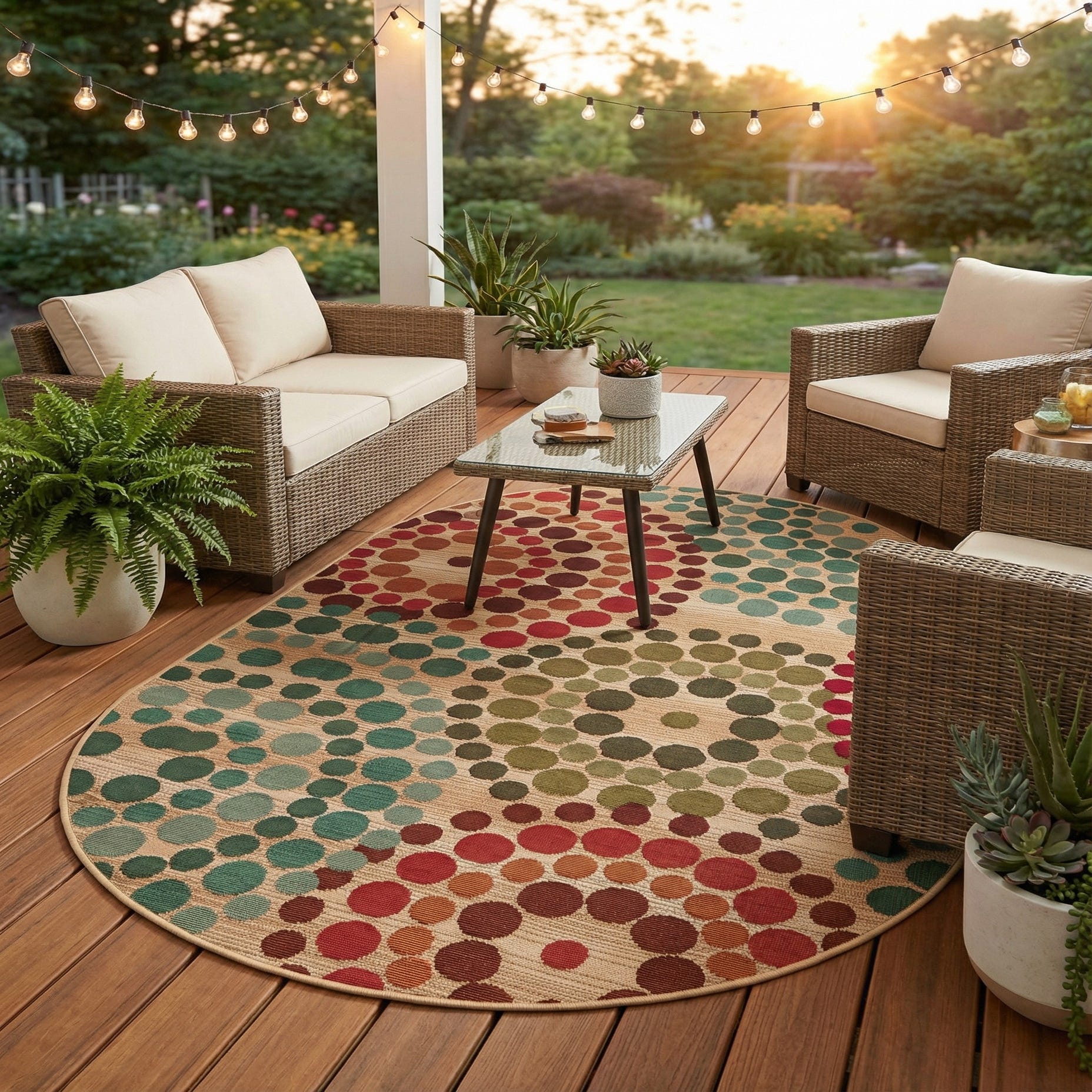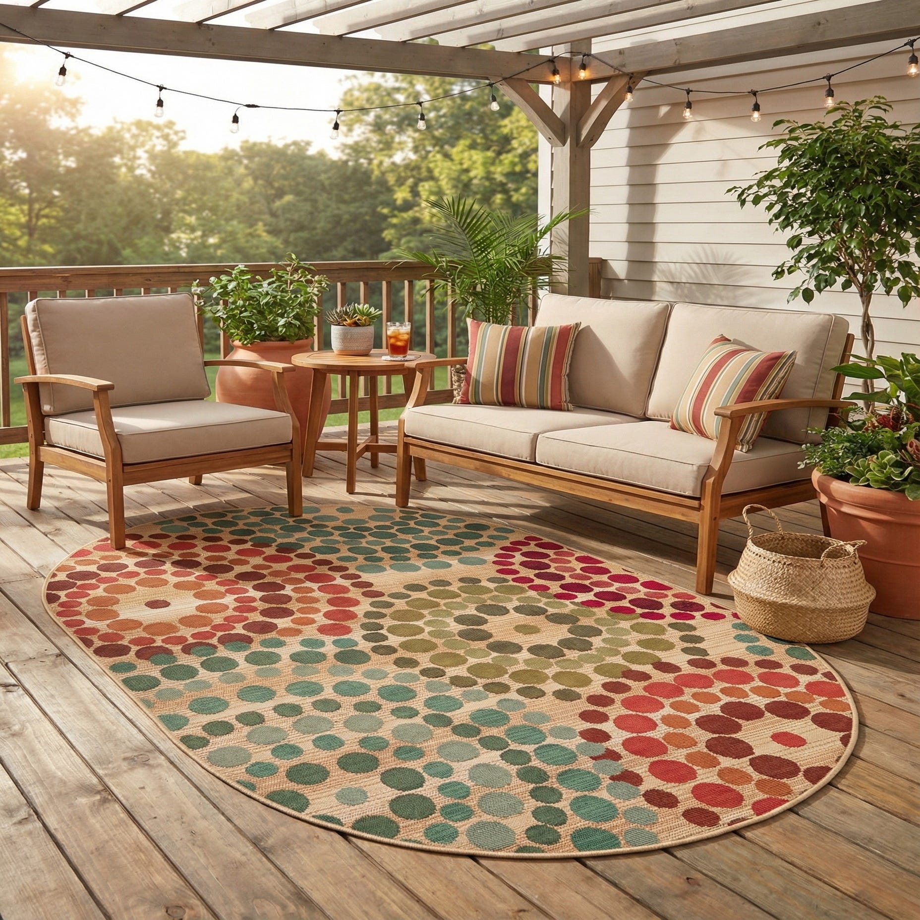 A 4' x 6' oval indoor/outdoor rug with an abstract pattern of various sized teal, red, and brown circles on a tan background.