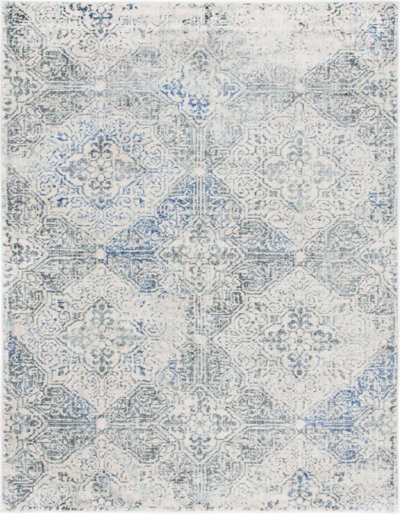 Primary color is Beige. Colors in this rug include: Beige, Gray, Navy Blue.