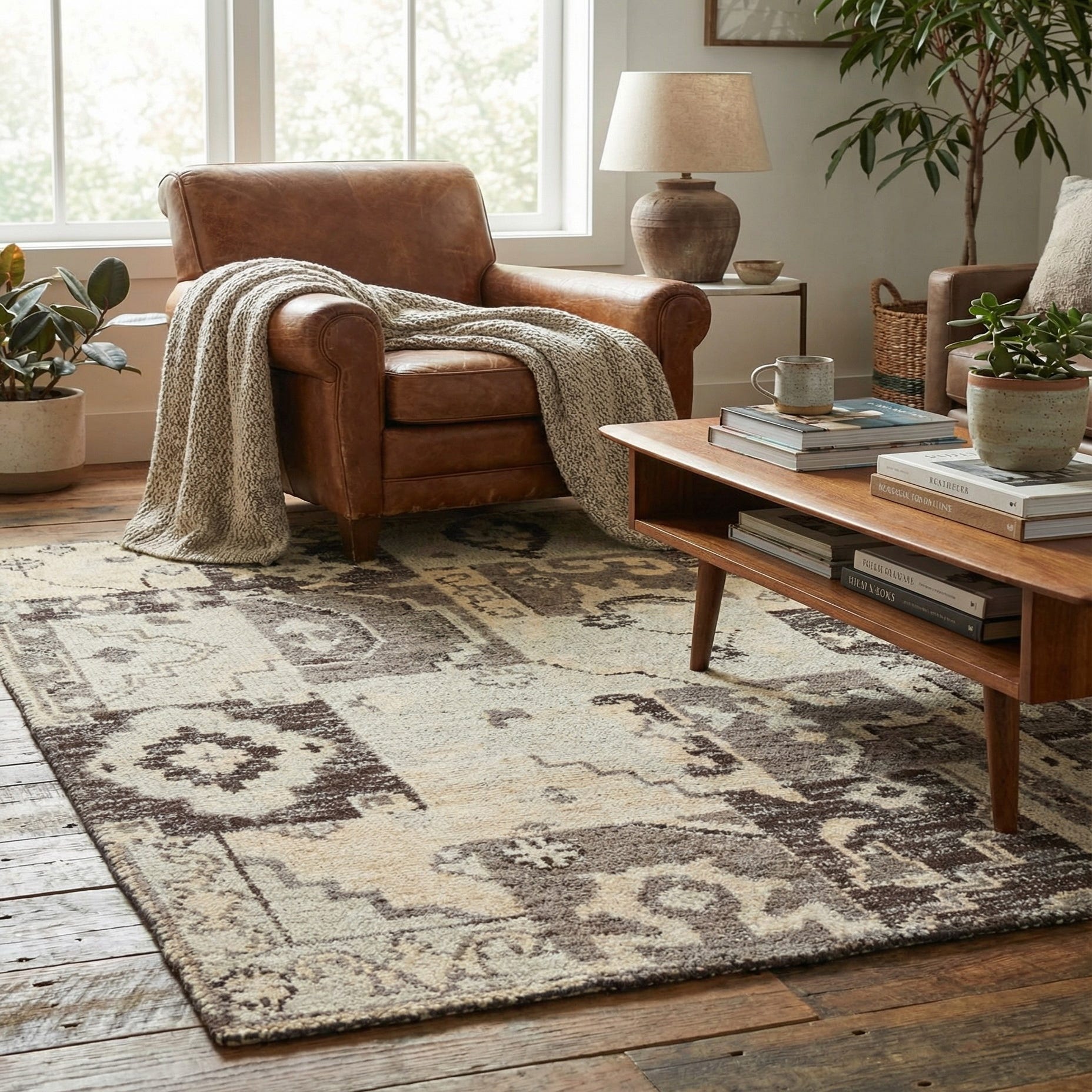 A 4x6 rectangular brown and ivory wool rug with a modern patchwork design, featuring various Oriental-inspired patterns.