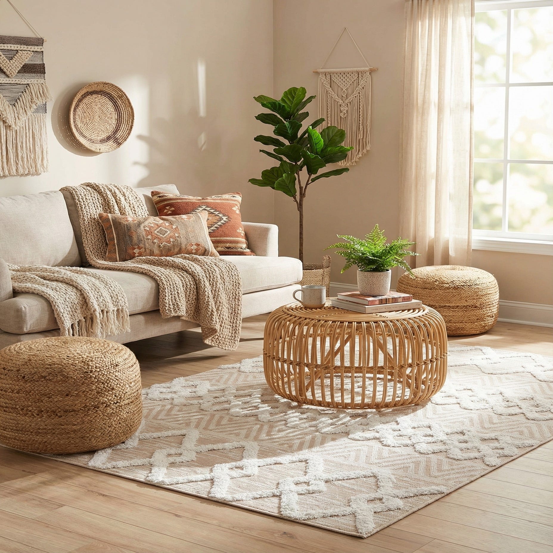 This rug works well in calm, layered interiors—place it beneath a coffee table in a light-filled living room, anchor a bedroom seating area, or add a soft, neutral layer to a coastal or modern farmhouse entry. Its understated colors pair easily with pale woods, linen upholstery, and soft metallic accents, and the mix of flat weave and raised texture makes it a good choice for spaces that balance comfort with clean, contemporary lines.