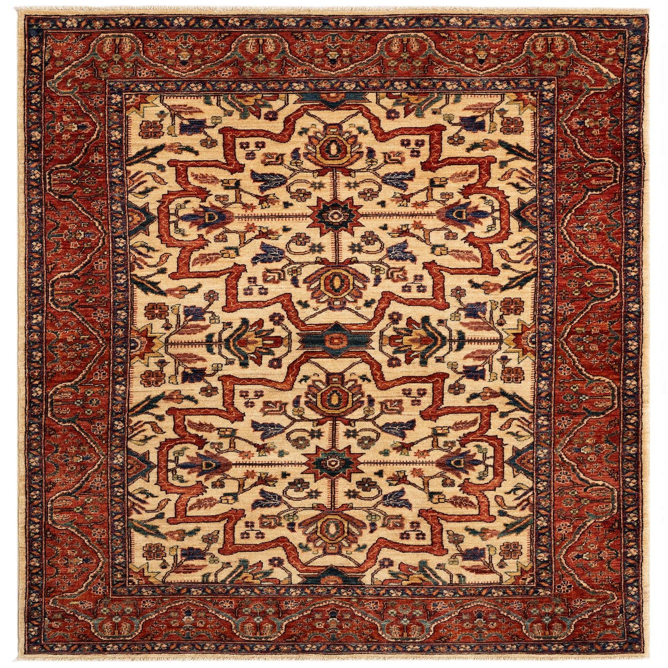 Primary color is Beige. Colors in this rug include: Beige, Beige, Red, Dark Blue, Yellow.