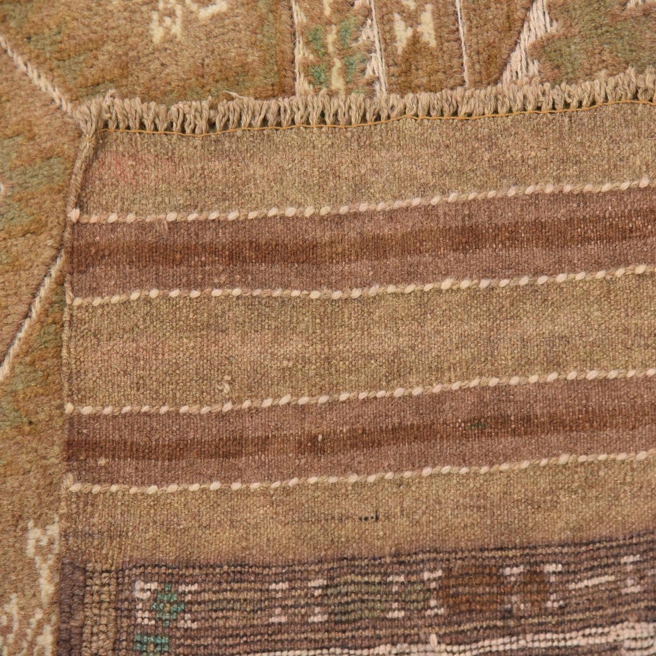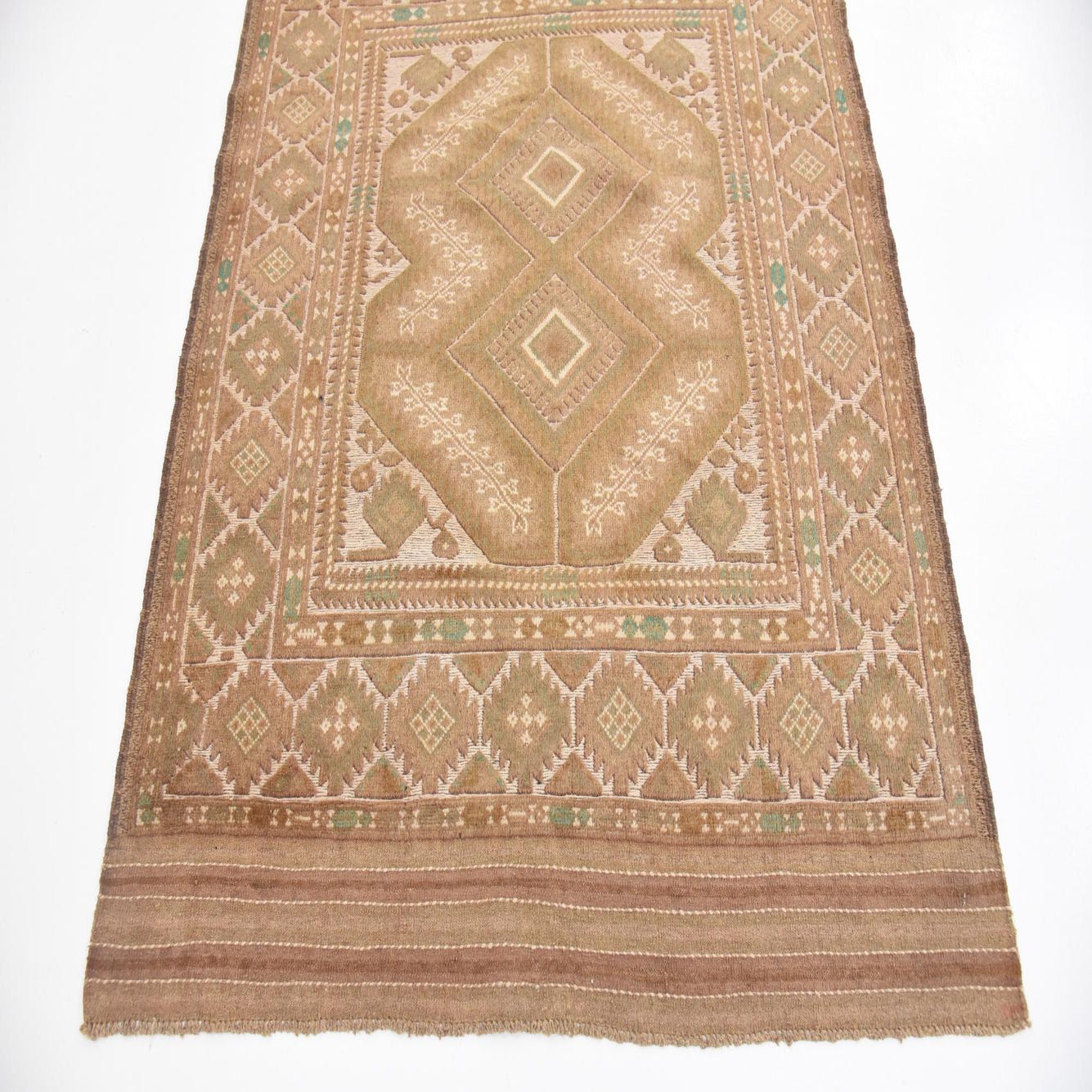 The Sumak collection presents a refined 4x6 hand-woven rug crafted from 100% wool, featuring a balanced beige background accentuated by brown and green hues. The design is anchored by a central diamond motif encapsulated by geometric patterns and tribal emblems, paying homage to traditional craftsmanship with a contemporary edge.