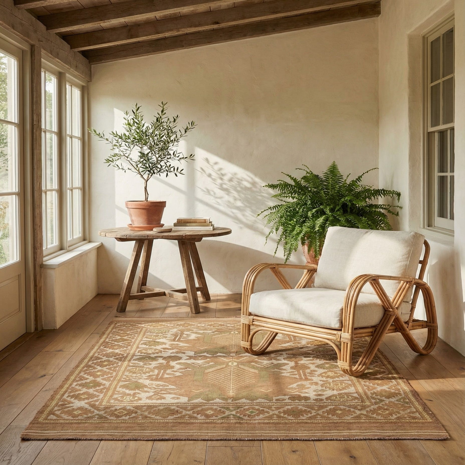 A 4x6 rectangular Sumak rug with a traditional botanical pattern in shades of brown, tan, and cream.