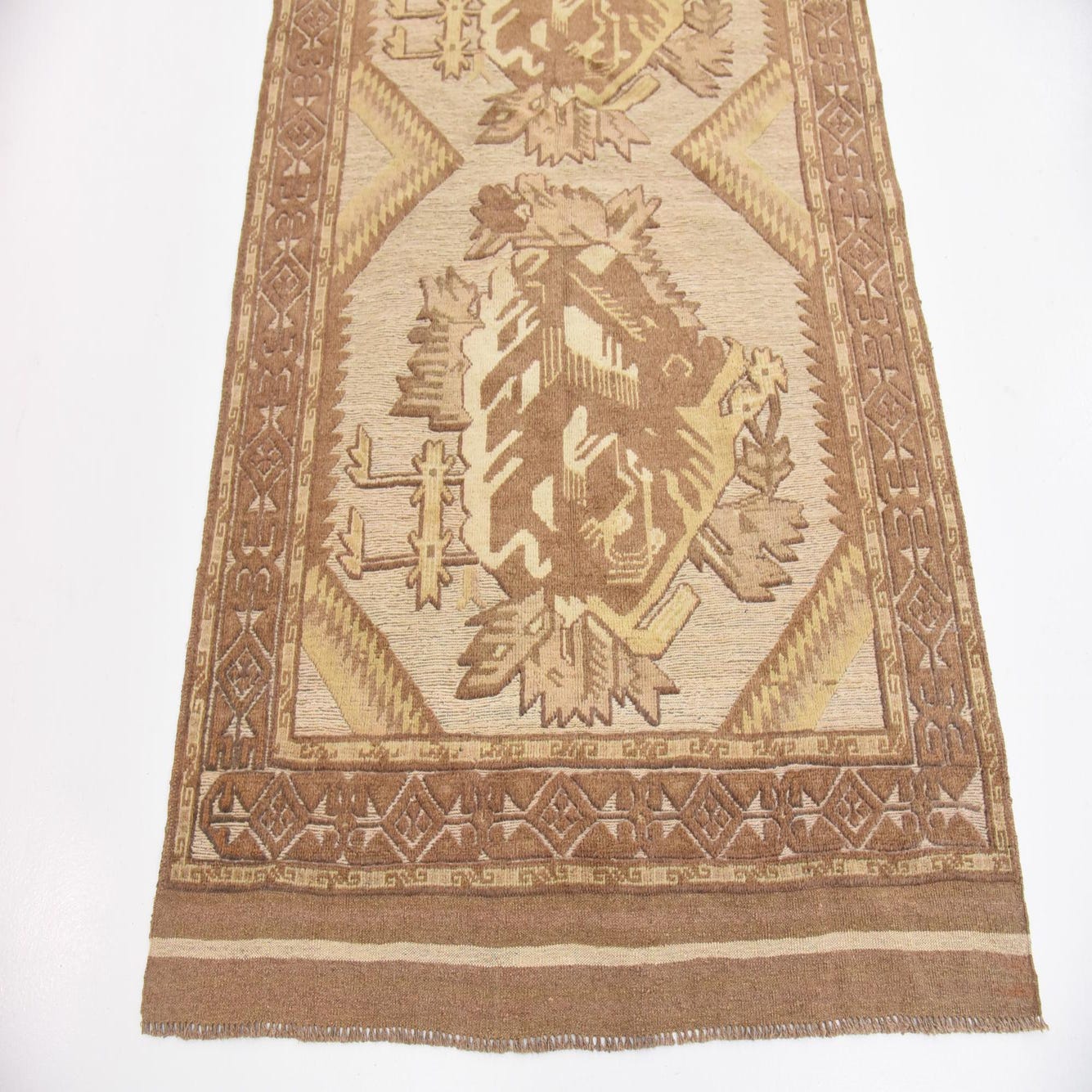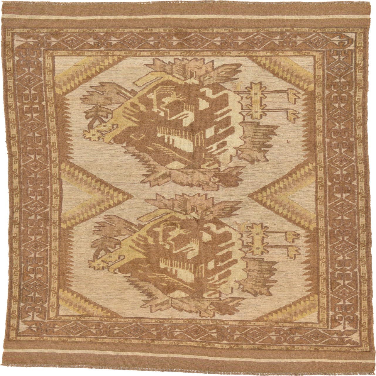 A 4x6 rectangular Sumak rug with a traditional tribal pattern in shades of brown, tan, and cream.