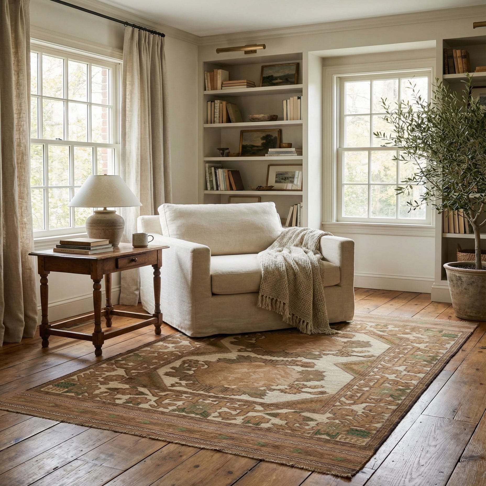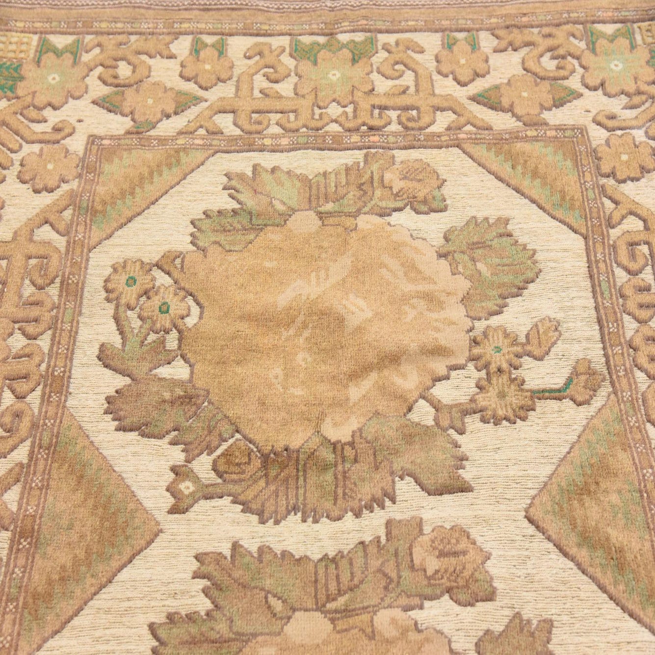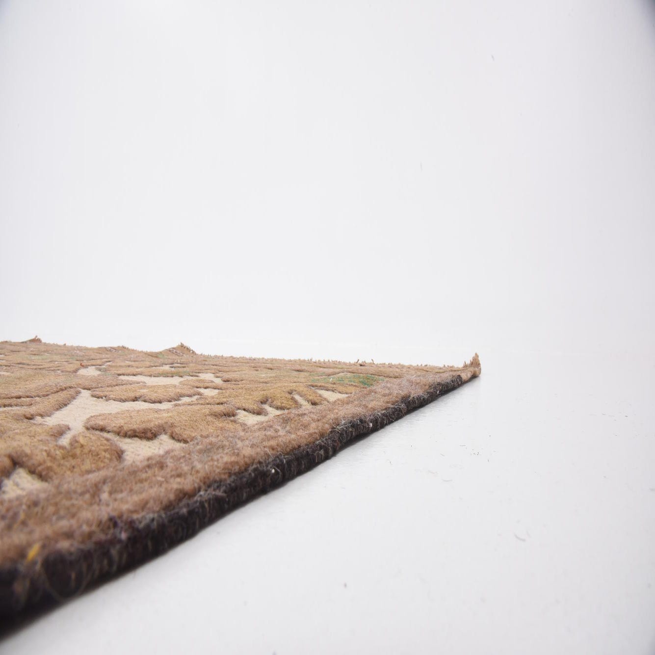 Primary color is Beige. Colors in this rug include: Beige, Brown, Green.