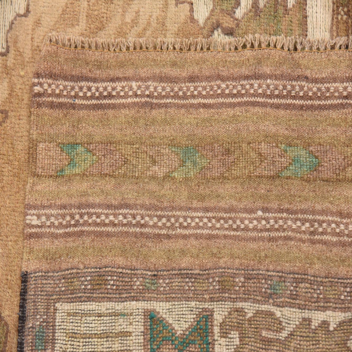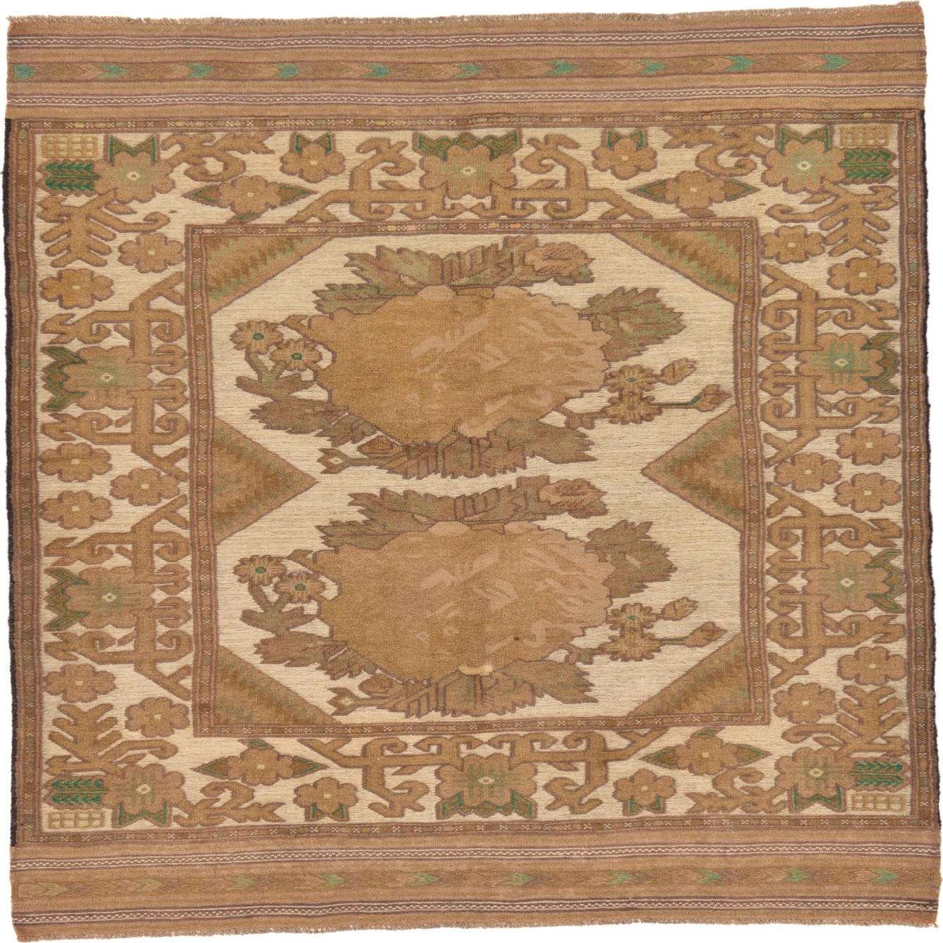 A 4x6 rectangular Sumak rug in browns, tans, and ivories, featuring a traditional tribal pattern with large floral medallions.