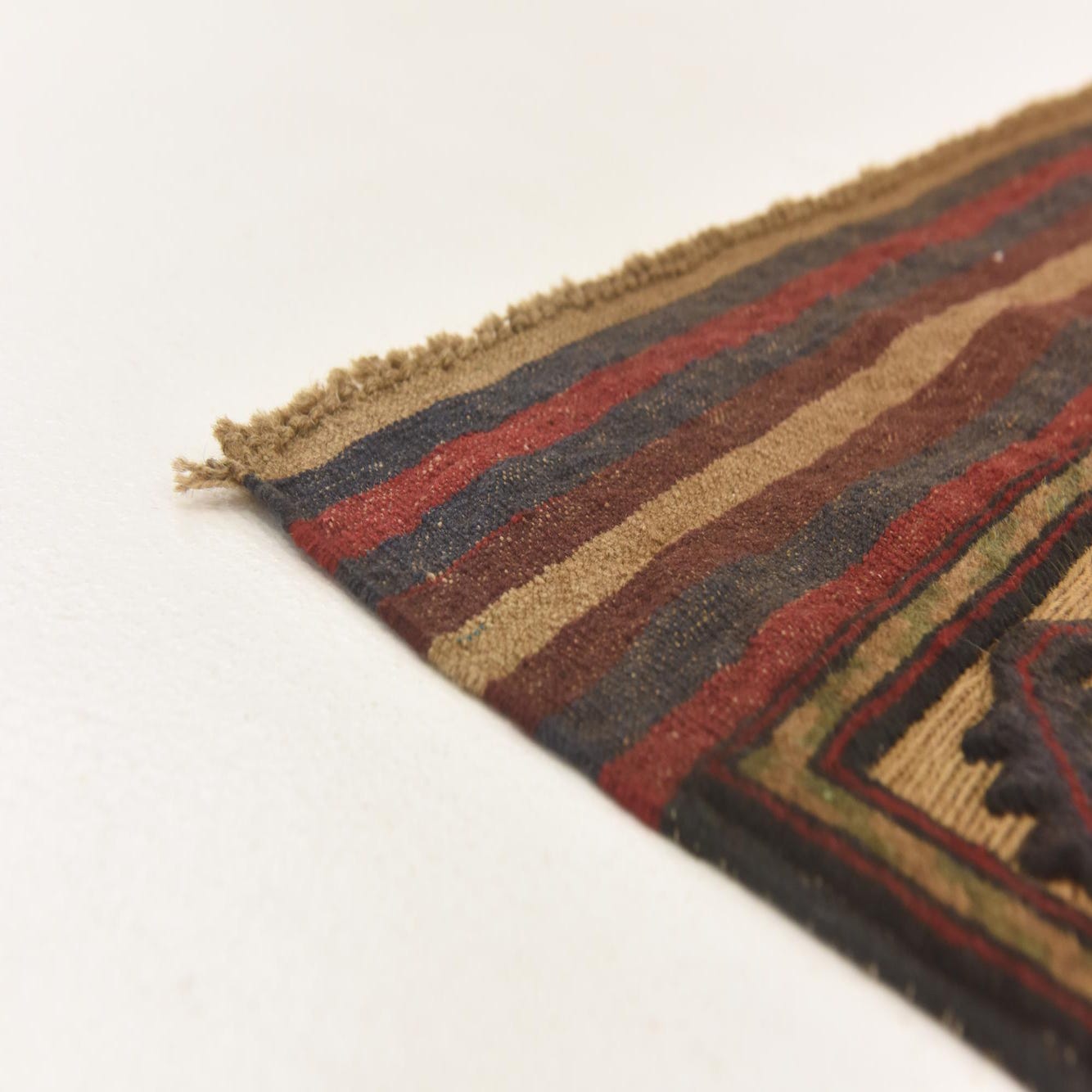 The fringe adds a traditional finishing touch, framing the rug's perimeter and enhancing its visual appeal. This Sumak rug is well-suited to a variety of decor settings, harmonizing with the warm tones of classic furnishings as well as adding contrast and interest to more contemporary spaces. Its medium size makes it an ideal choice for living room centerpieces, cozy bedroom floors, or grounding a dining area with a touch of sophistication.