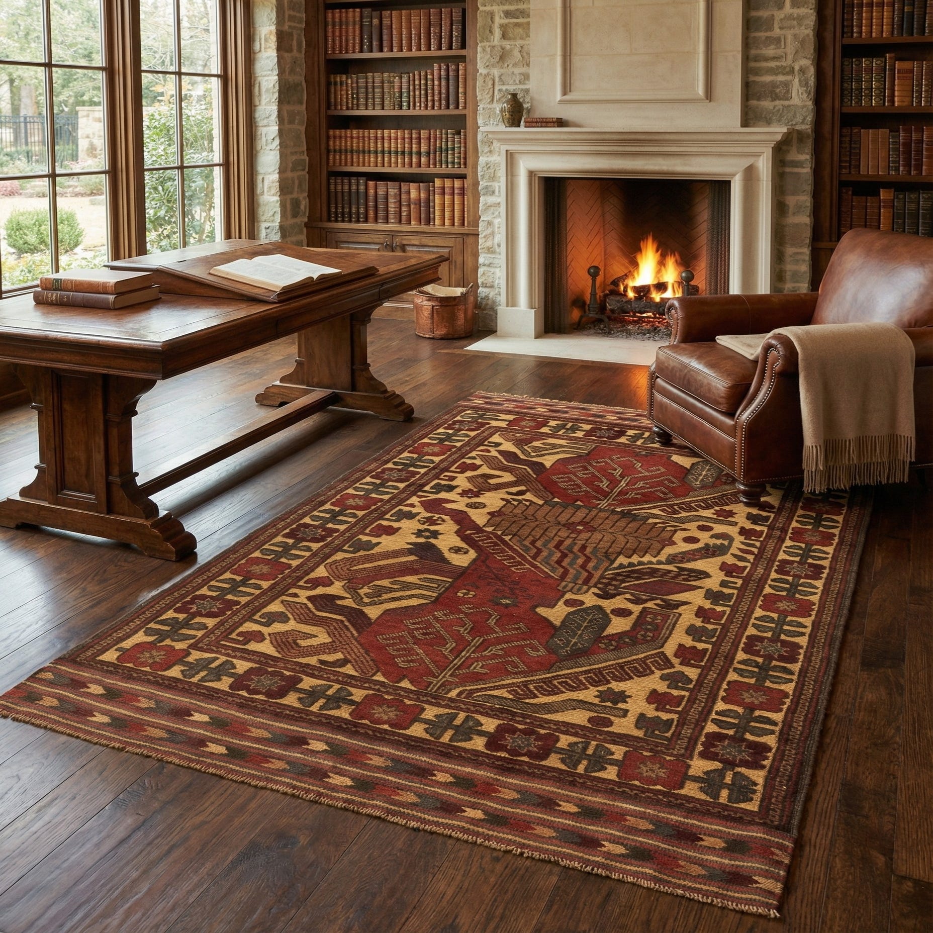 The textured weave of 100% wool provides a tactile experience that complements the visual depth of the rug's colors and patterns. The Sumak rug can serve as a grounding element within a variety of interior spaces; it would stand out in a traditional office or den, harmonize with the rich woods in a classic study, or add warmth to the understated elegance of an eclectic living room. Its robust palette and pattern also make it suitable for anchoring furniture in a dining room, bringing in a sense of time-honored style without overwhelming the space.