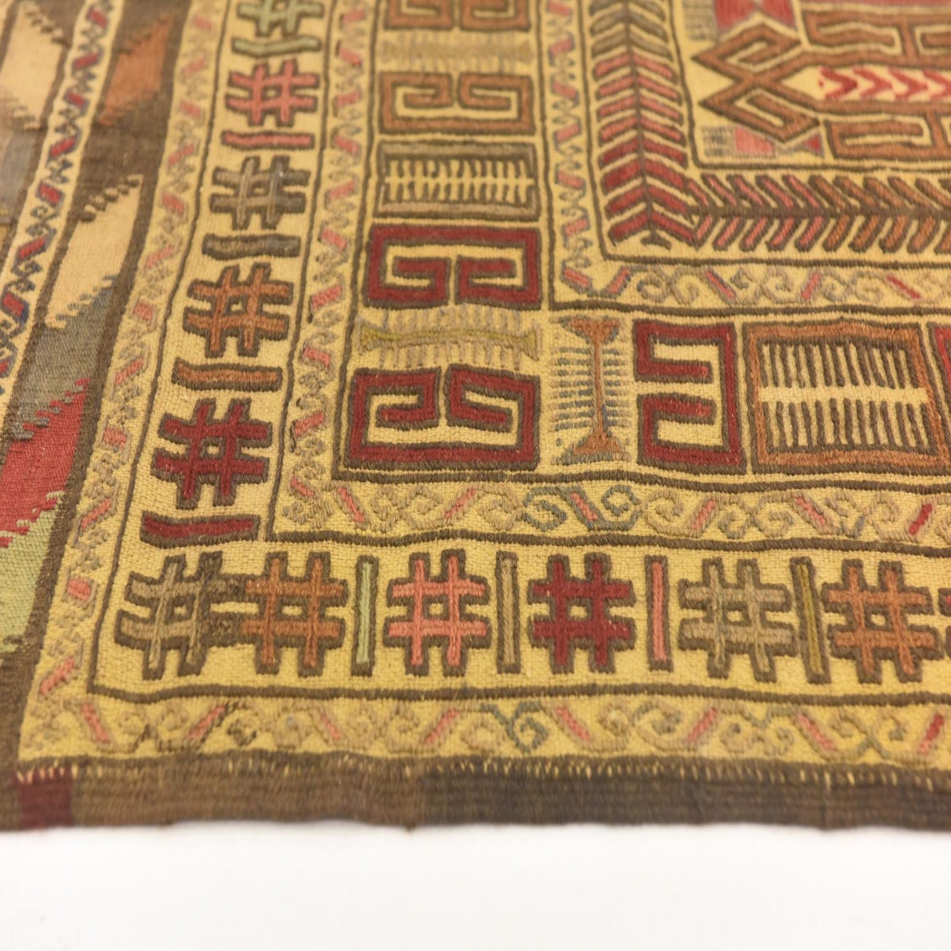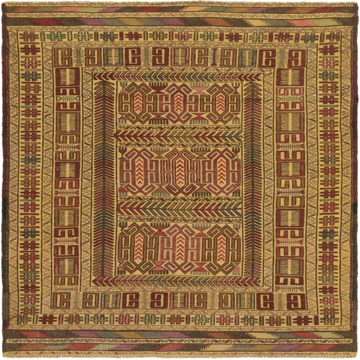 This Sumak collection rug is a hand-knotted piece, meticulously crafted from 100% wool, offering a rich and durable texture that exudes a sense of timeless charm. The 4x6 rug features an array of warm and inviting hues, including beige, brown, gold, olive, orange, red, and yellow, with beige serving as the foundational background color. Adorned with intricately detailed patterns and symbols that evoke a tribal aesthetic, the rug showcases a cohesive design with a central geometric composition flanked by decorative borders.