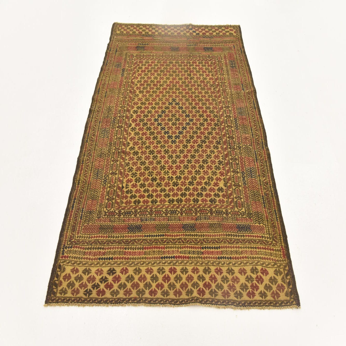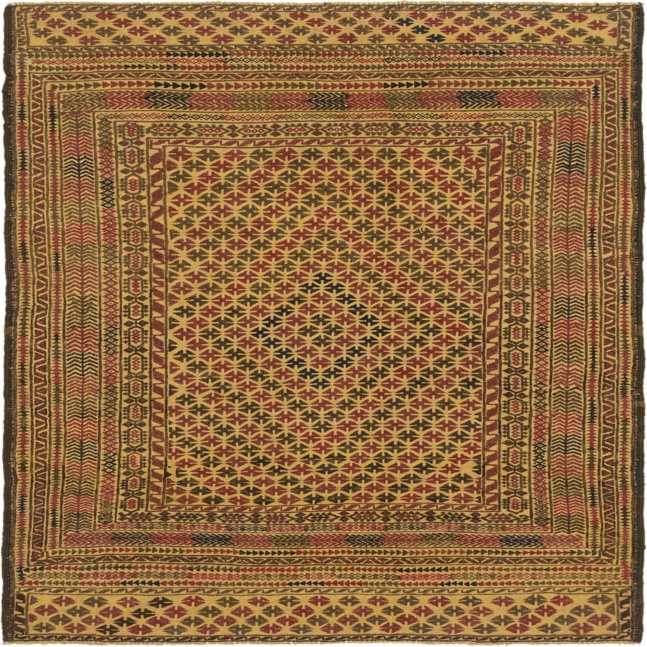 A 4x6 rectangular Sumak rug with a flat pile, featuring a traditional tribal medallion pattern in browns, tans, and creams.