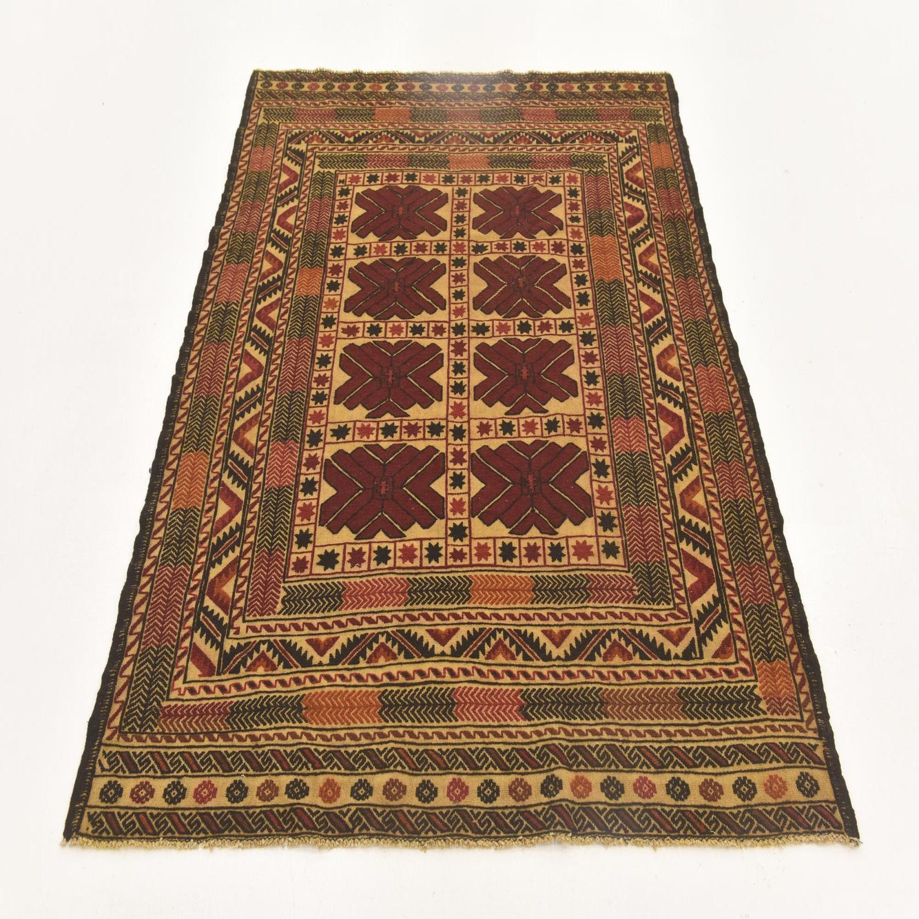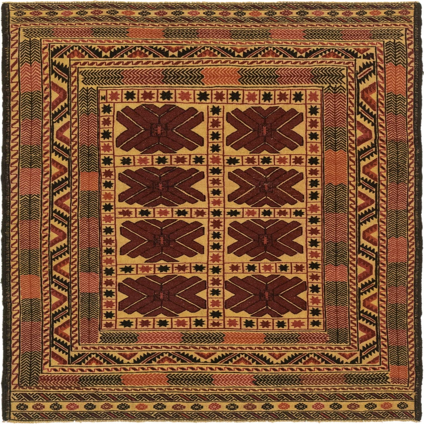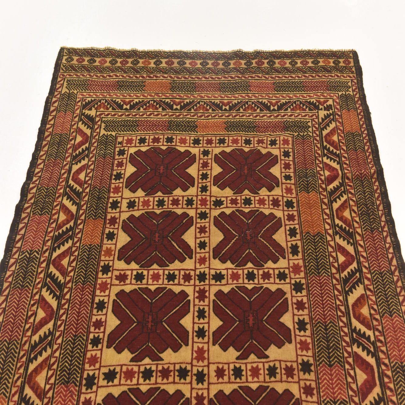 A 4x6 rectangular Sumak rug with a traditional tribal pattern in shades of brown, tan, and cream.