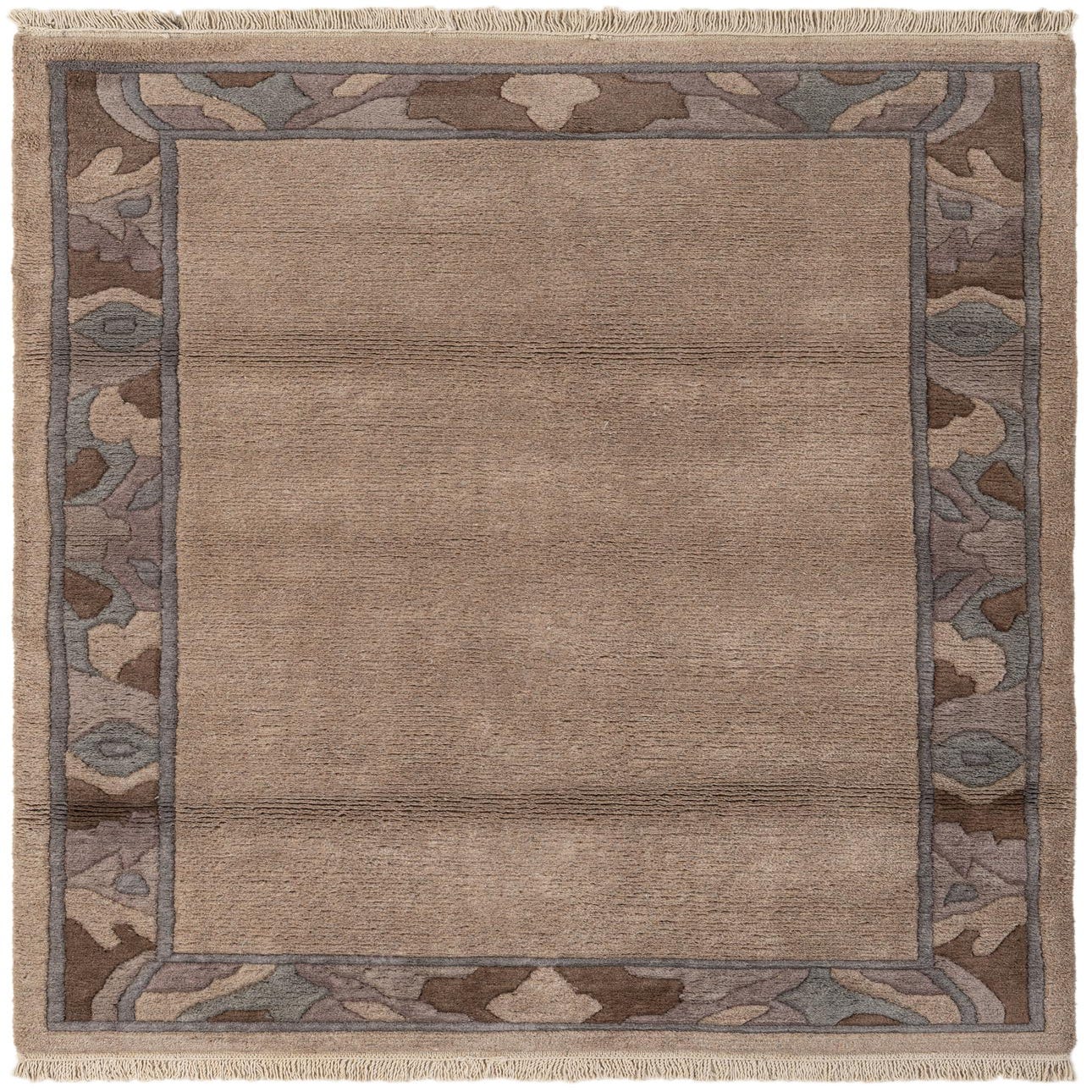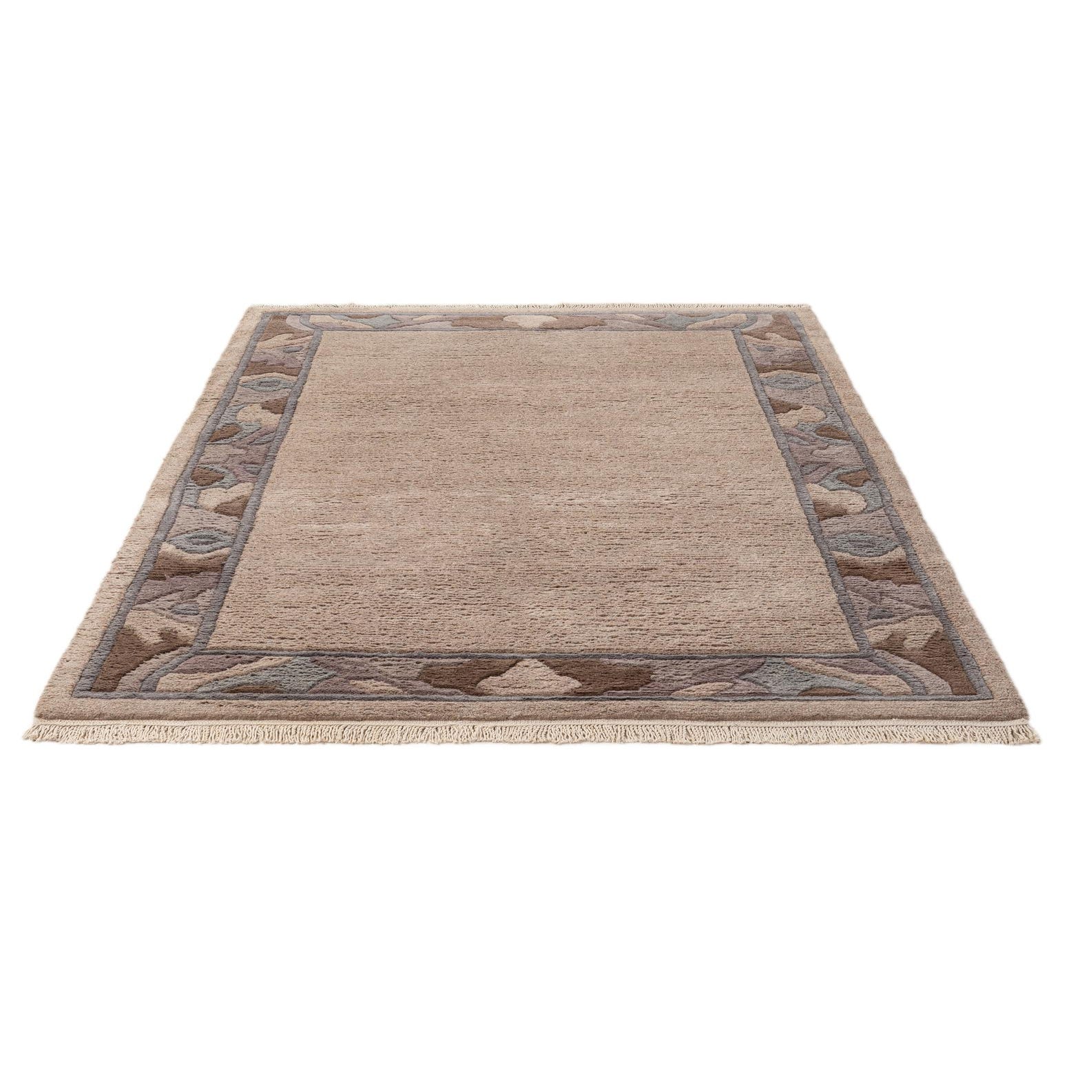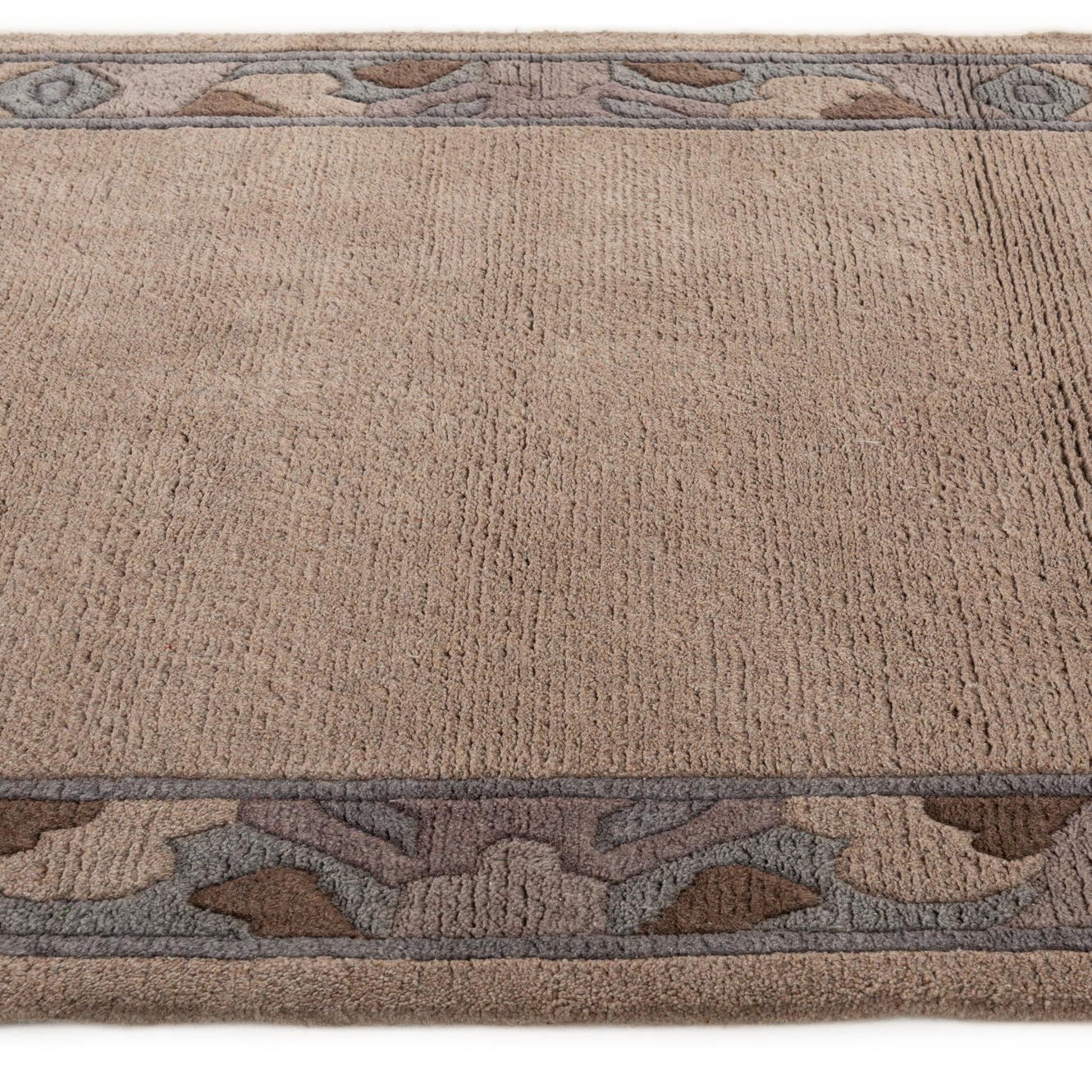 A rectangular 4x6 brown wool area rug with a modern oriental border in shades of brown, tan, and cream.