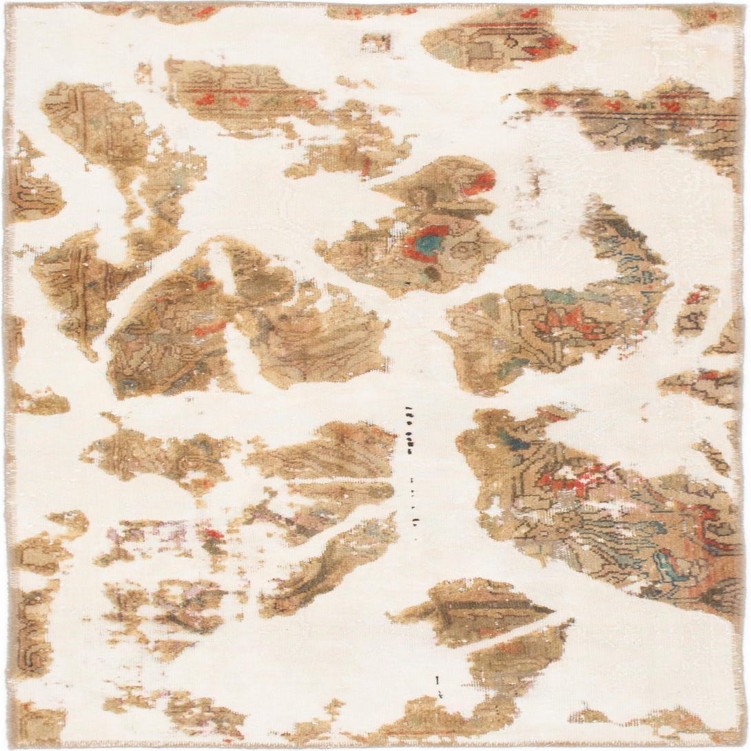 A 4x6 rectangular Ultra Vintage wool rug featuring an abstract distressed Persian pattern in browns, tans, and ivories.