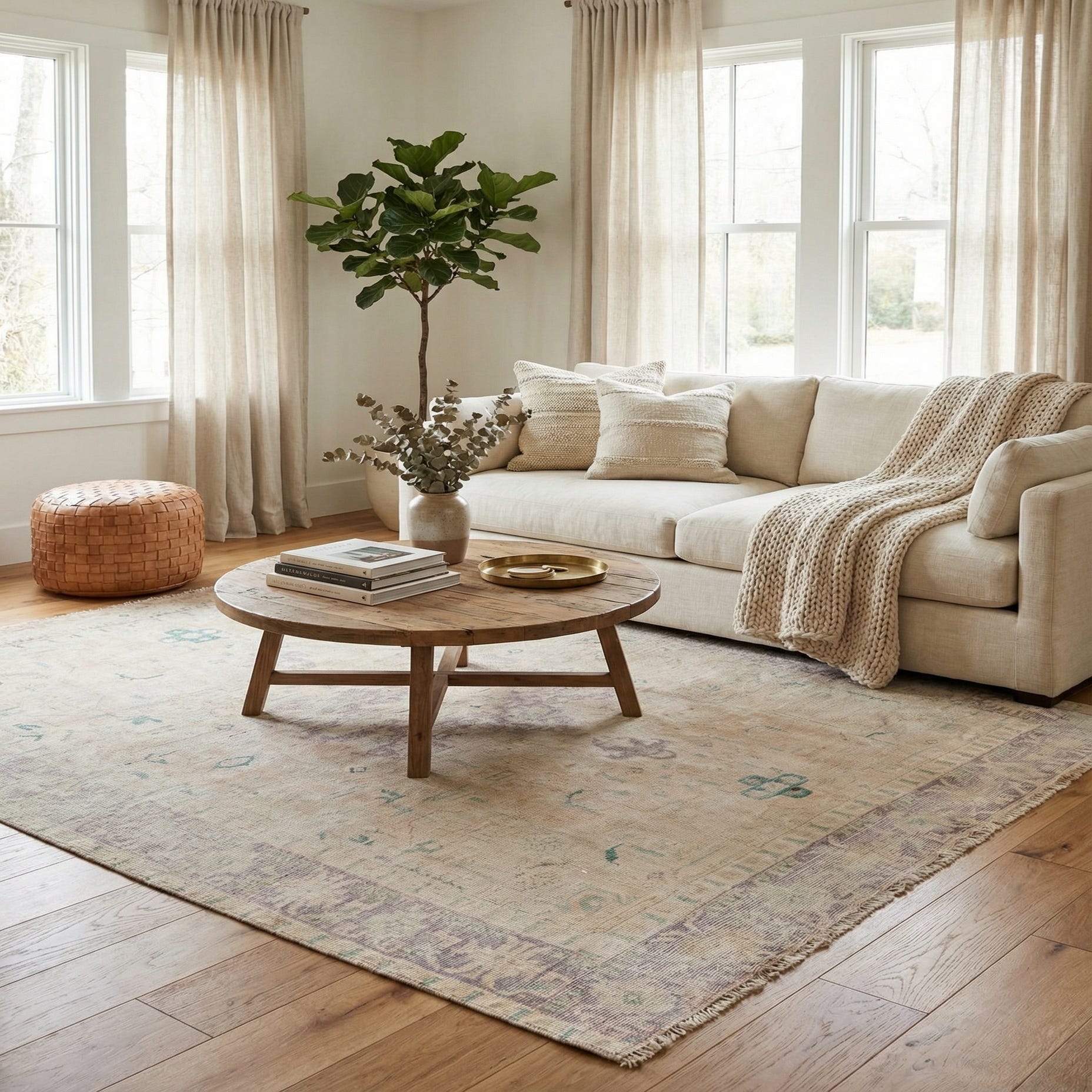 A 4x6 rectangular Ultra Vintage wool rug in browns, tans, and creams with a faded Persian medallion pattern.