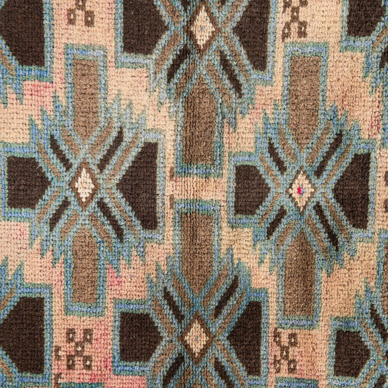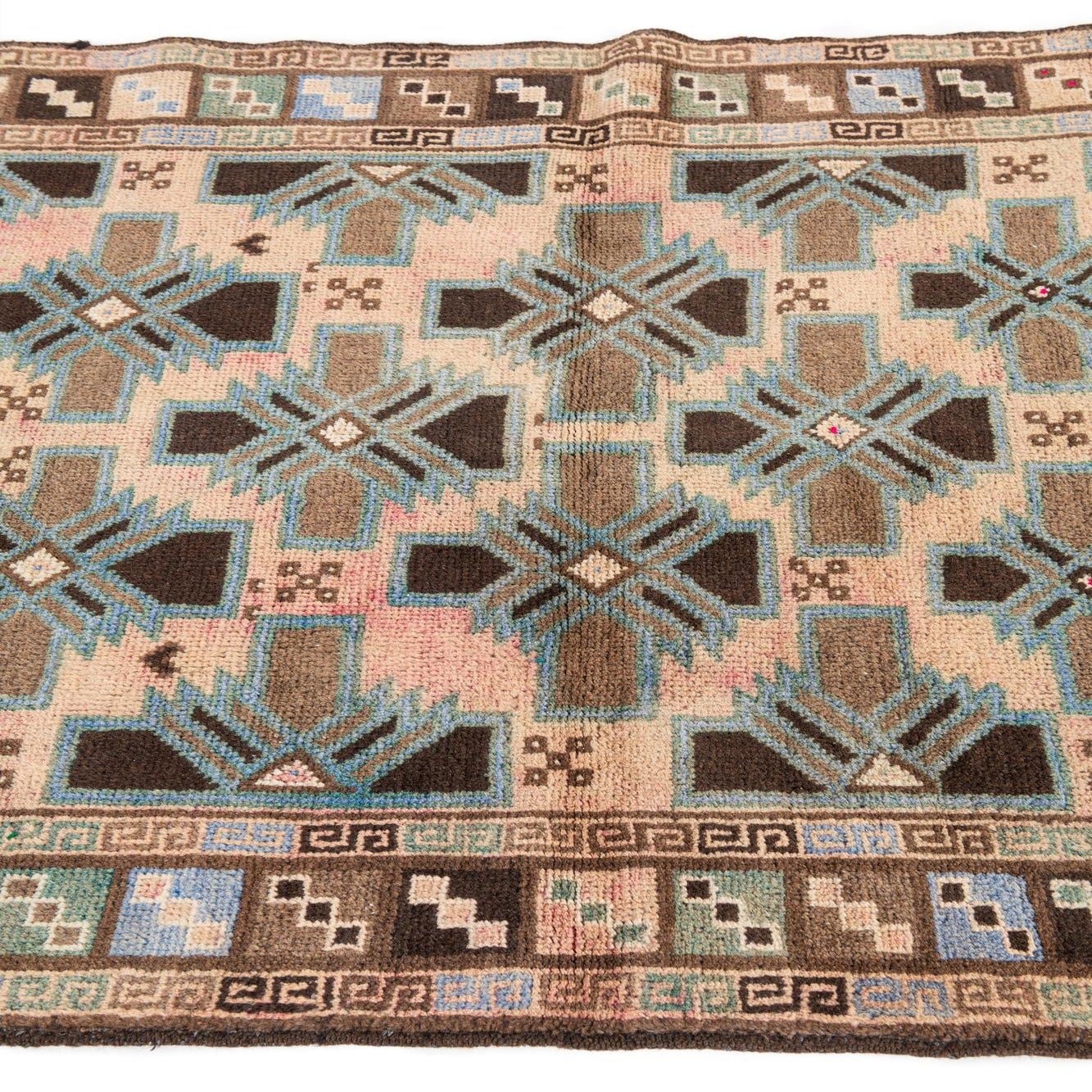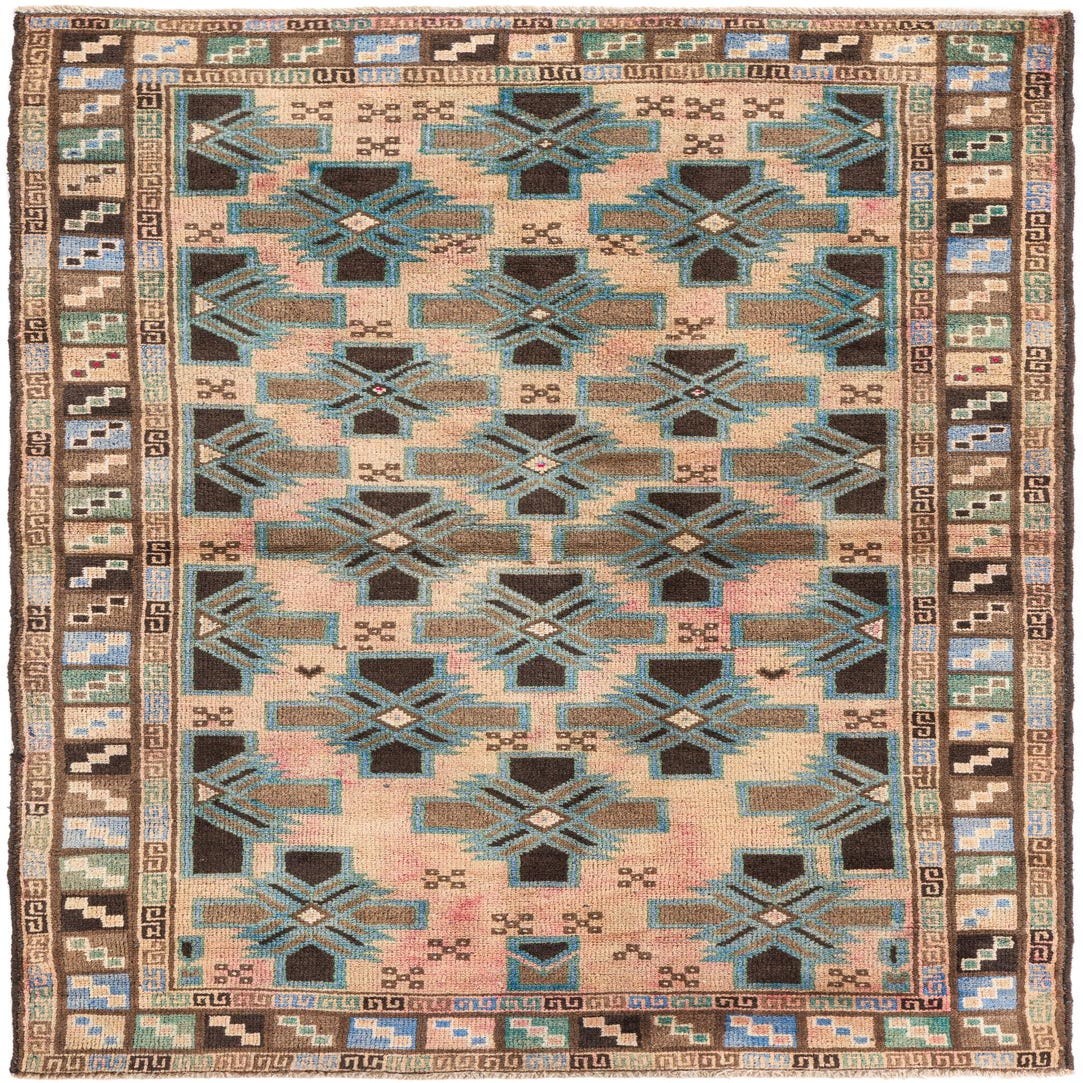 A 4x6 rectangular Ultra Vintage wool rug featuring a geometric Persian pattern in browns, tans, ivories, and subtle blues.