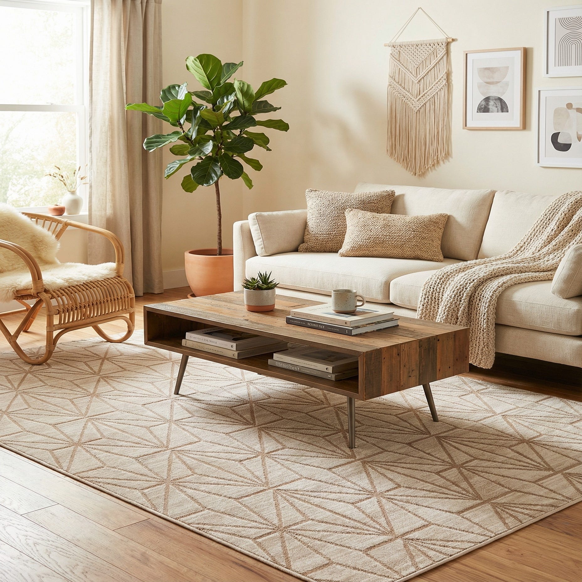 This piece works well in contemporary living rooms, minimalist bedrooms, home offices, or transitional dining areas. Pair it with natural wood furniture and linen or leather upholstery for a warm, layered effect, or use it to balance bolder colors and patterns as a calming foundation. Its neutral palette and refined geometry make it easy to integrate into Scandinavian, modern, or casual chic interiors.