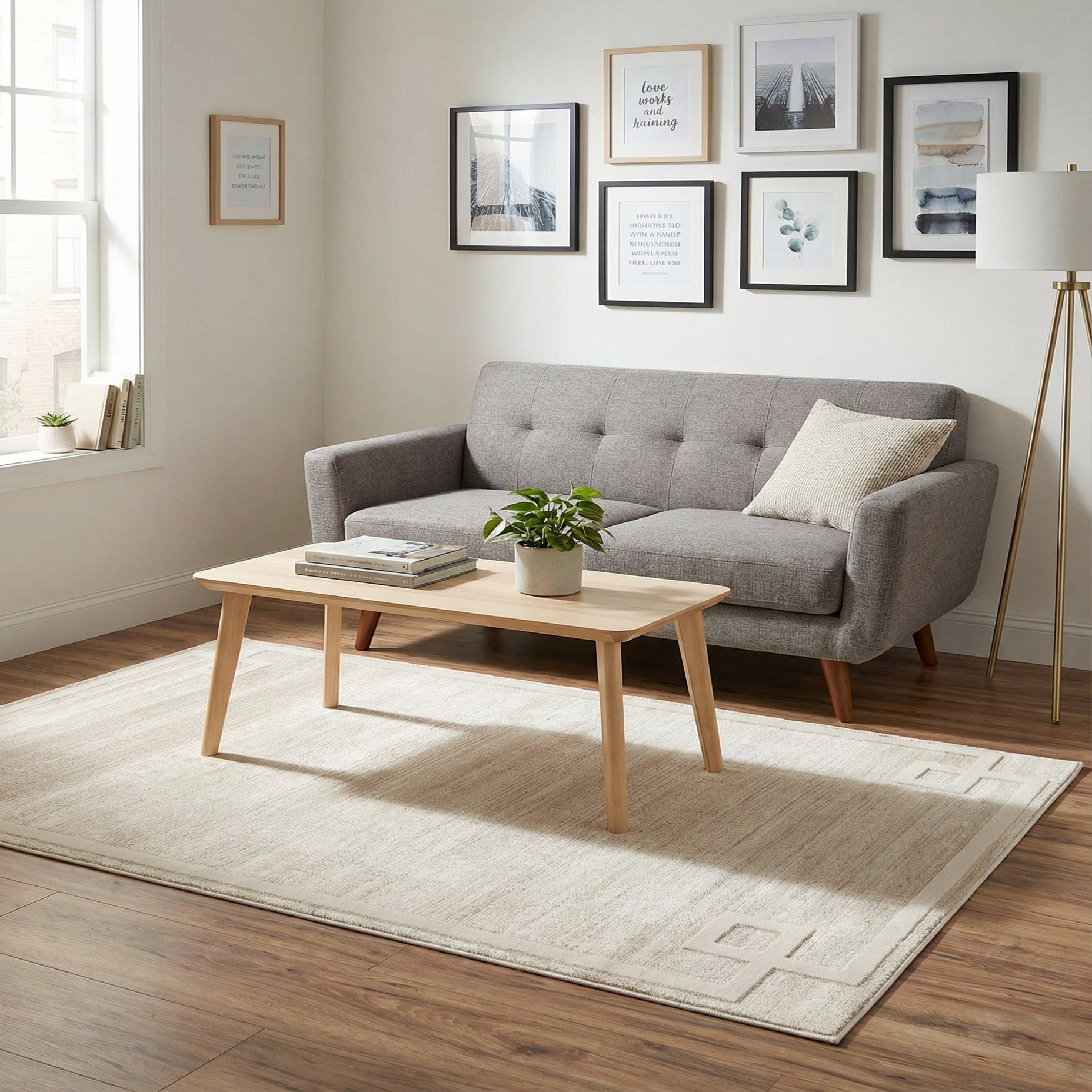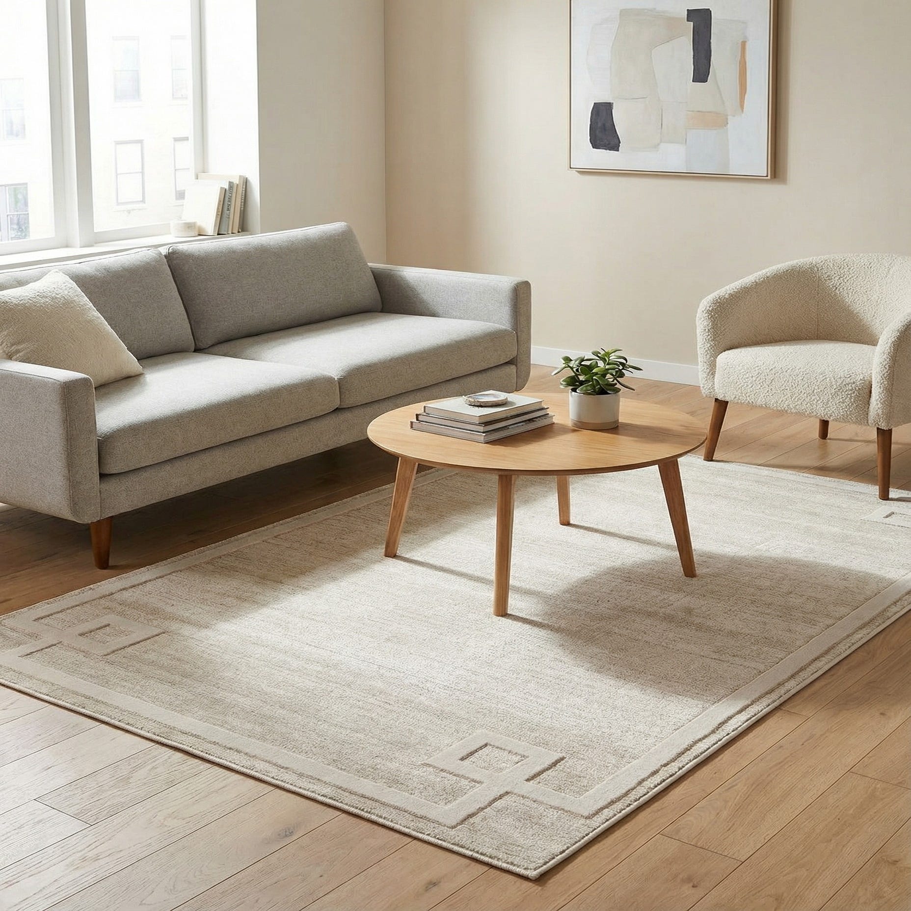 This rug fits easily into modern, transitional, Scandinavian, or coastal interiors, pairing well with light-wood furniture, linen upholstery, and matte metal accents. Use it to anchor a cozy seating area, layer beneath a bed to add warmth to a bedroom, or place in an entryway or home office to introduce a soft, neutral backdrop. Its quiet palette and simple geometry make it a versatile choice when you want a calm, polished base for the rest of the room.
