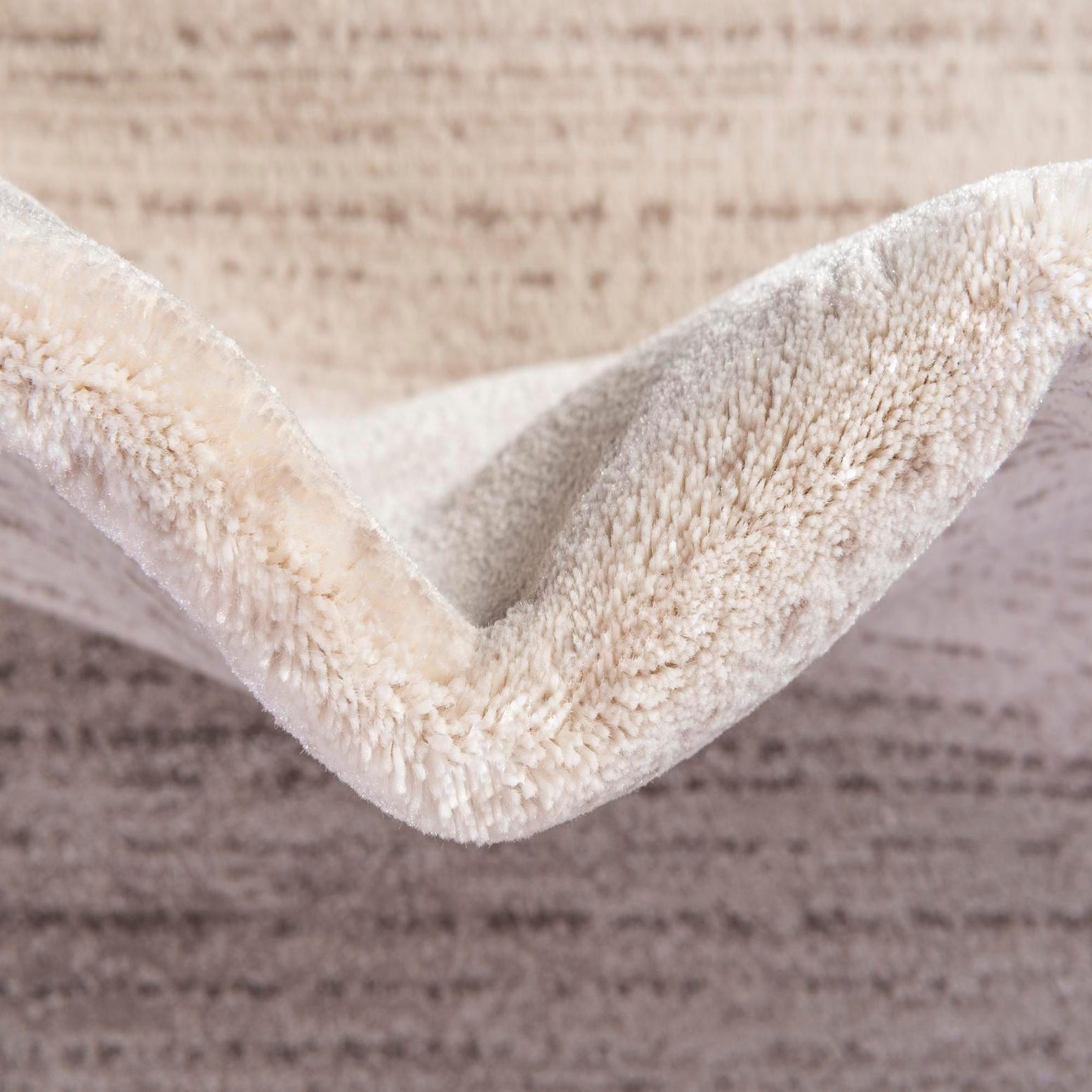 A soft, tonal field in beige creates a calm, neutral foundation, punctuated by light brown striations that give the surface a gently weathered look. A clean, linear border in ivory frames the rug, with understated geometric corner motifs that add architectural interest without overwhelming the design. The pile has a low, smooth hand with slight low-relief in the bordered areas for a subtle textural contrast; machine made of 70% polypropylene and 30% polyester, it offers a refined drape and a faint, natural sheen.