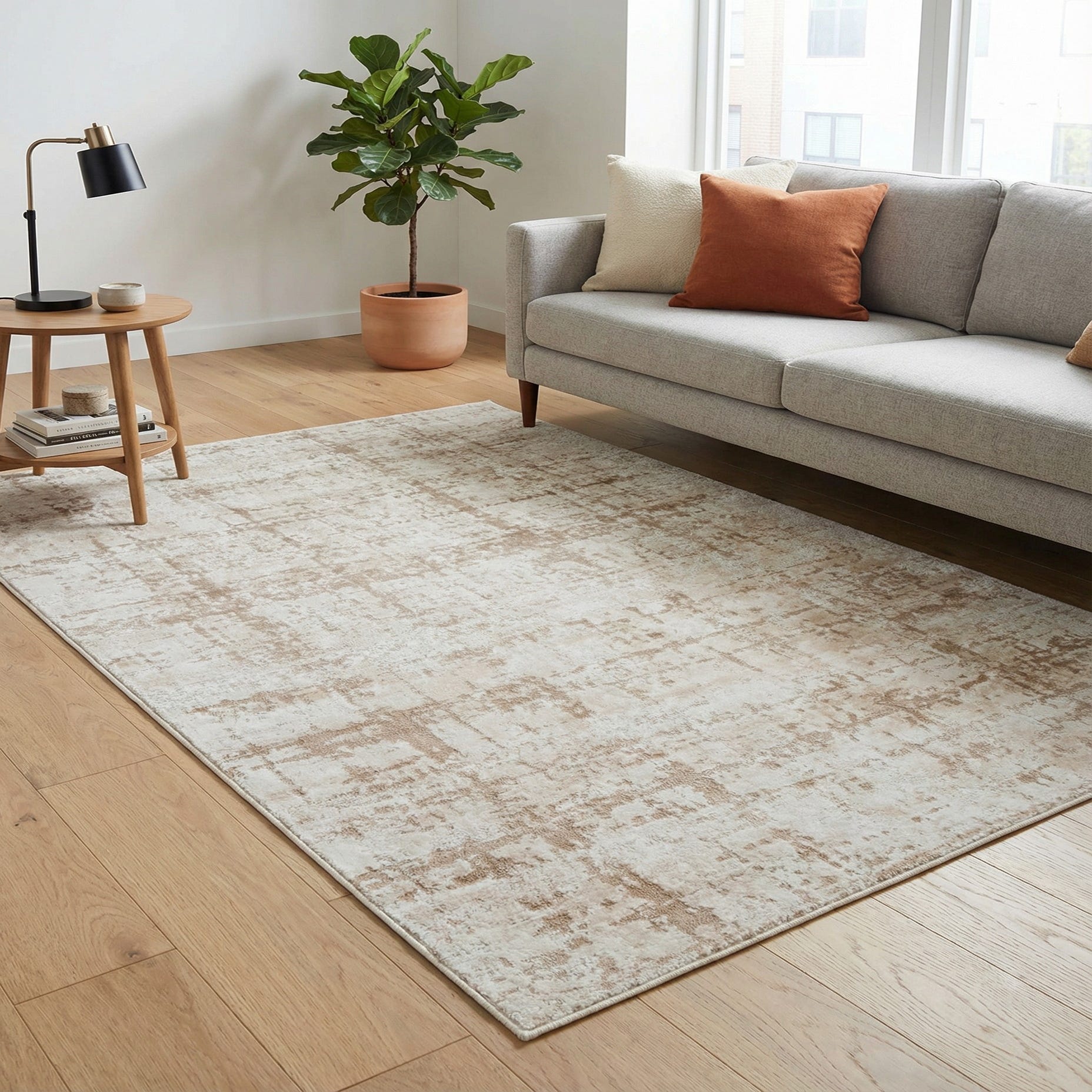 A soft, painterly pattern gives this rug a calm, lived-in look. The beige background provides a warm foundation while layers of cream and ivory form a subtle, crosshatched distressed motif that reads modern and understated. The overall effect is quiet texture rather than bold contrast, making the design easy to pair with a variety of furnishings.