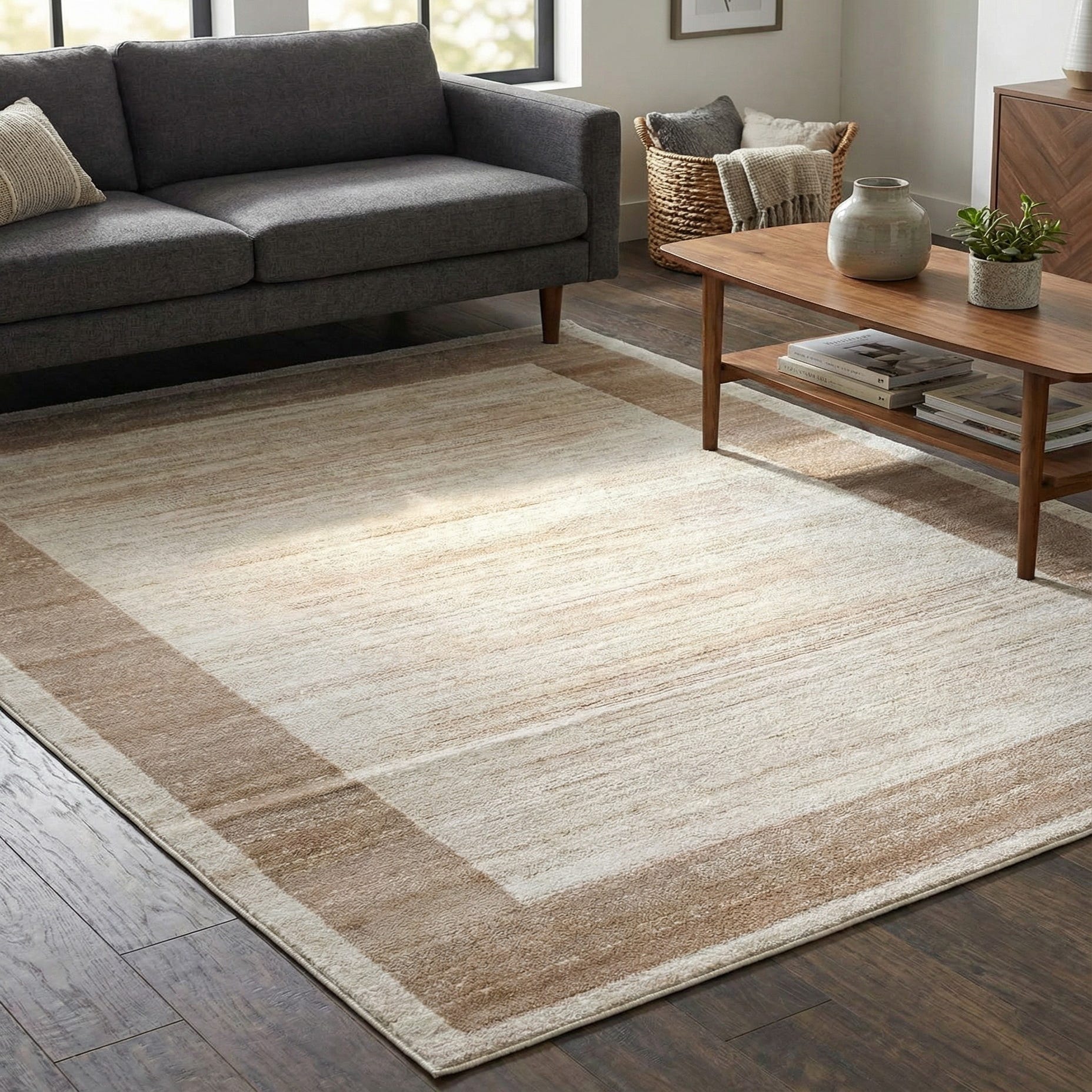 A soft, understated border design anchors this rug in warm neutrals. A beige ground provides a gentle base while a cream center panel contrasts with a light-brown band that frames the field. Horizontal, irregular striations run across the surface, giving the pattern a lived-in, tonal texture that stays visually quiet without overwhelming a room. The overall effect is modern-traditional, leaning toward minimalist and transitional interiors.