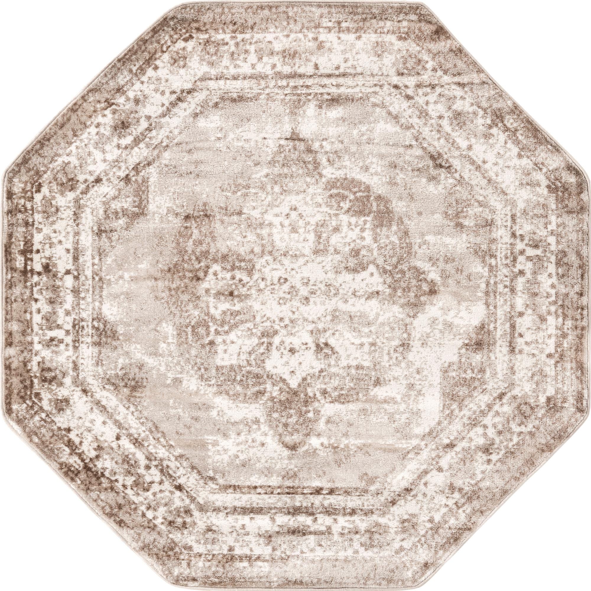 Octagonal in shape with a beige background, this rug presents a softly distressed medallion motif rendered in warm brown and ivory tones. The pattern blends a faded central medallion with layered border details, creating a vintage-inspired look that reads muted and refined rather than busy. Machine-made from 100% polypropylene, the piece has a low, dense pile with a smooth hand and a subtle luster that highlights the tonal variation across the surface.