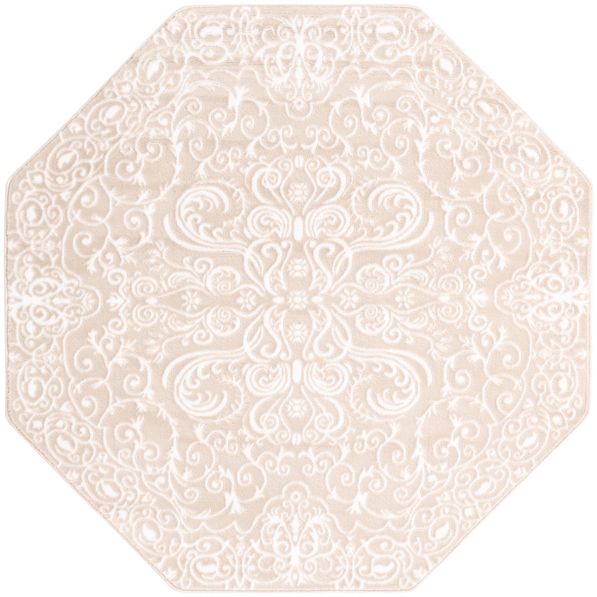 An octagonal rug with a classic medallion and scrolling arabesque motif in ivory set against a warm beige background. The symmetrical pattern of floral-inspired loops and swirls is slightly raised, giving a soft cut-and-loop texture that you can feel underfoot. Machine made of 55% polypropylene and 45% polyester, the pile is low-profile and plush to the touch while the neutral ivory-on-beige palette keeps the overall look light and refined.