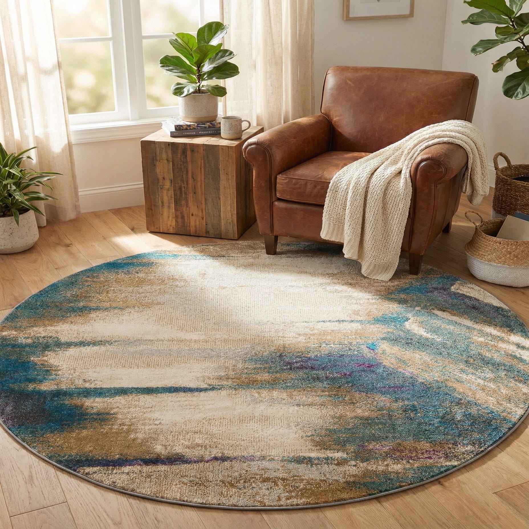 This round piece works well to define a cozy seating group, anchor a breakfast nook beneath a round table, or soften a bedroom corner or reading area. It pairs naturally with natural wood tones and linen upholstery, and contrasts nicely with both matte-black metal accents for a modern look or warm brass and leather for a more layered, transitional space.