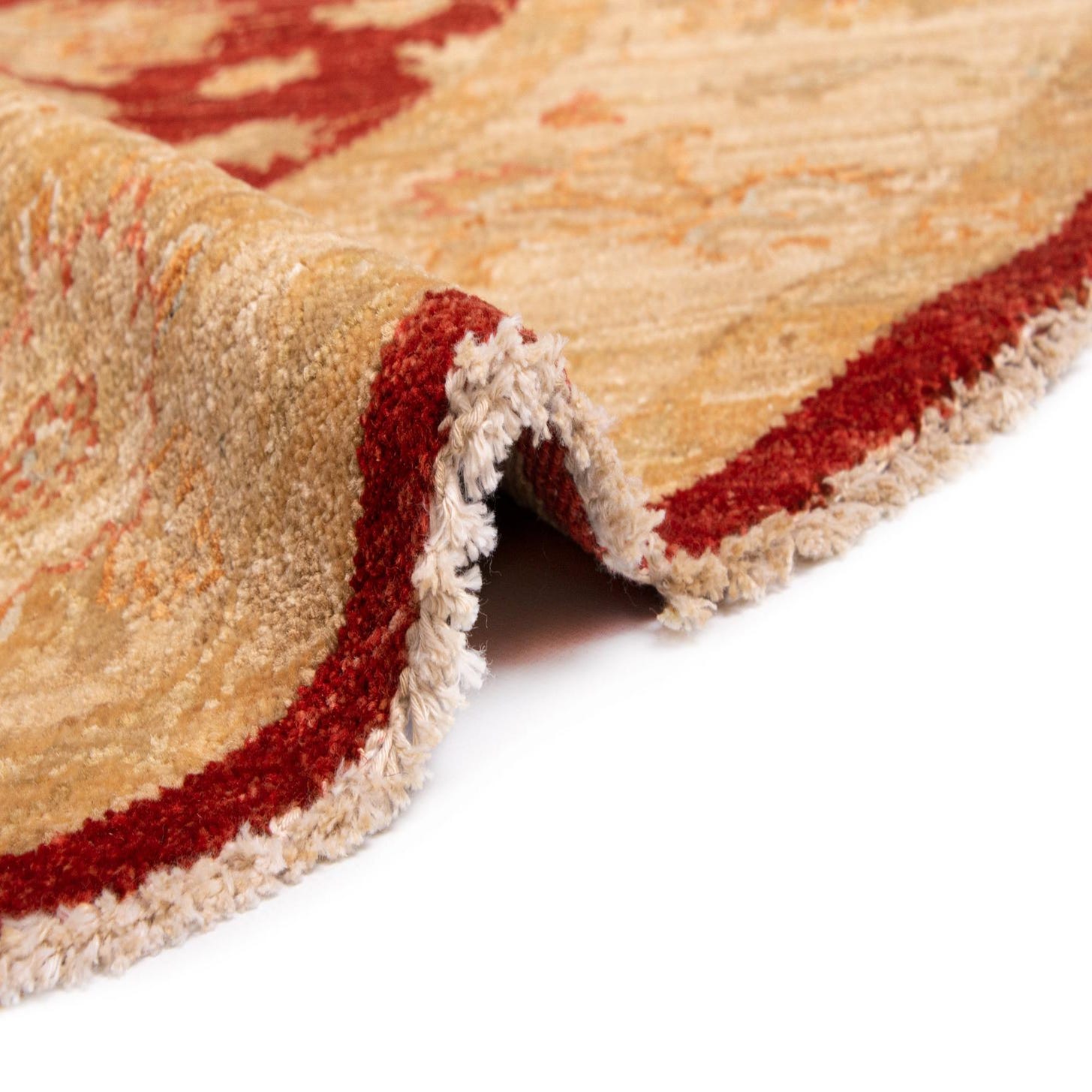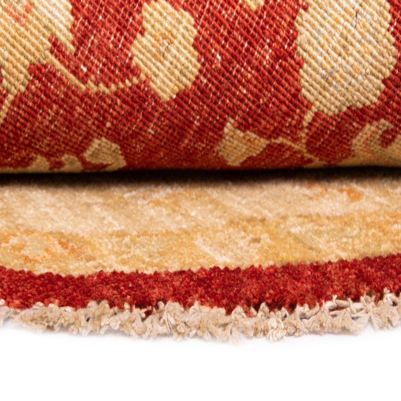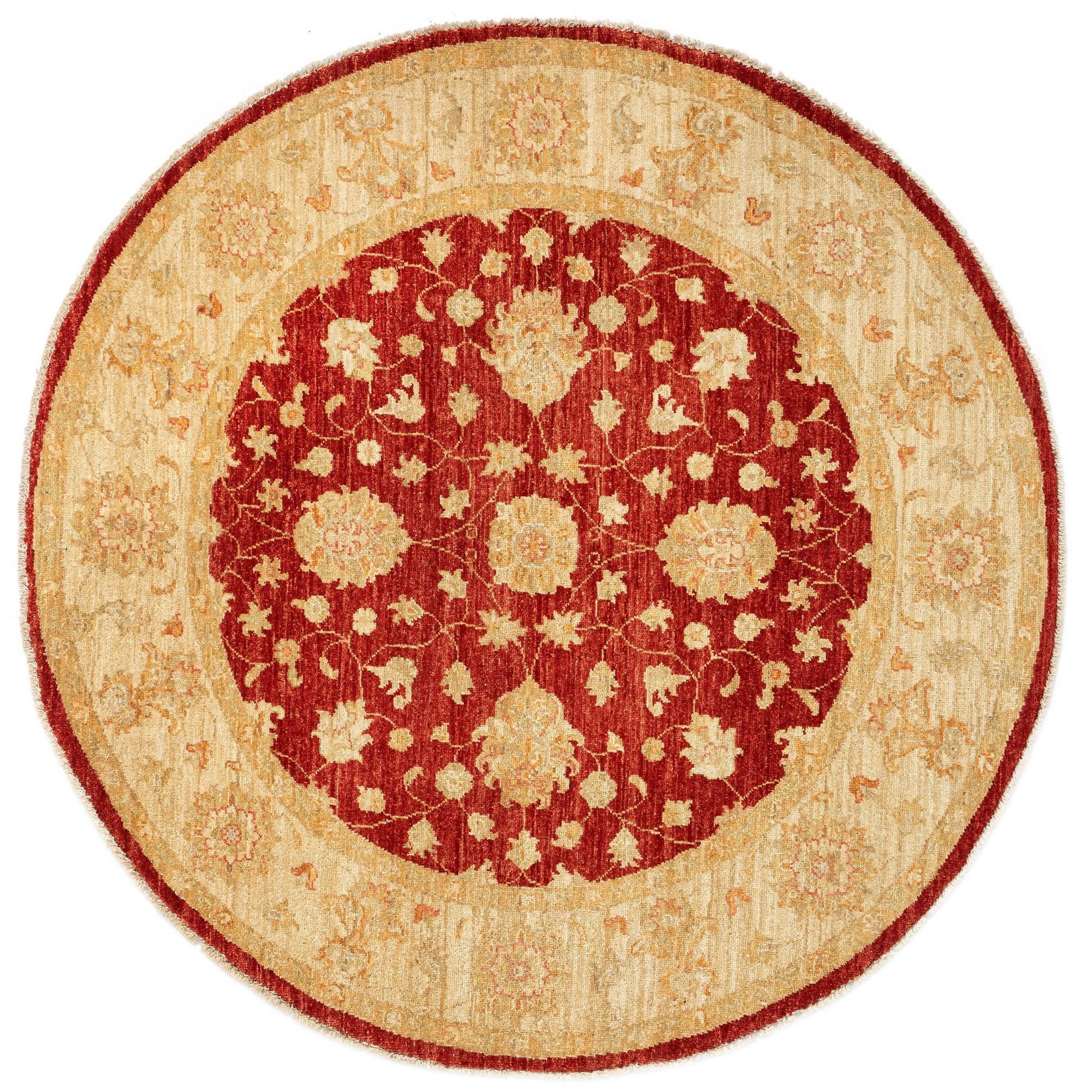 The Kaizar Collection presents a handcrafted 5 ft round rug, meticulously woven with 100% wool. This rug offers a harmonious blend of beige and red, set against a predominantly beige background, creating a warm and inviting palette. The central red field is adorned with an intricate pattern of floral motifs and organic elements, demonstrating sophisticated craftsmanship.