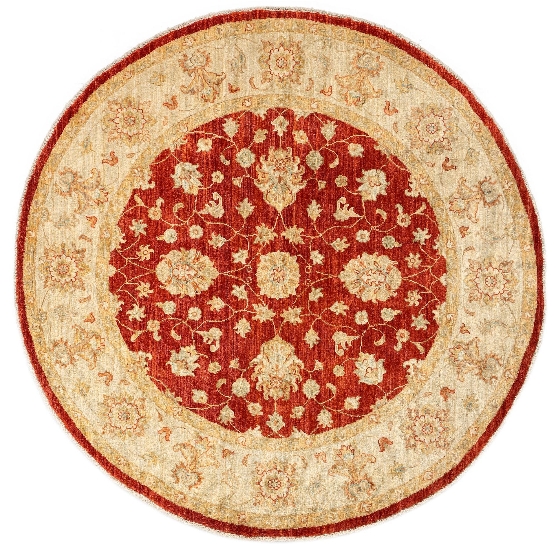The Kaizar Collection presents a 5 Ft Round rug that is handcrafted for a unique and durable addition to any space. This piece features a traditional pattern with intricate floral motifs and border detailing. The color palette includes a warm and rich red as the primary hue, complemented by beige detailing and a beige background, creating a harmonious blend that enhances the rug's classic appeal.