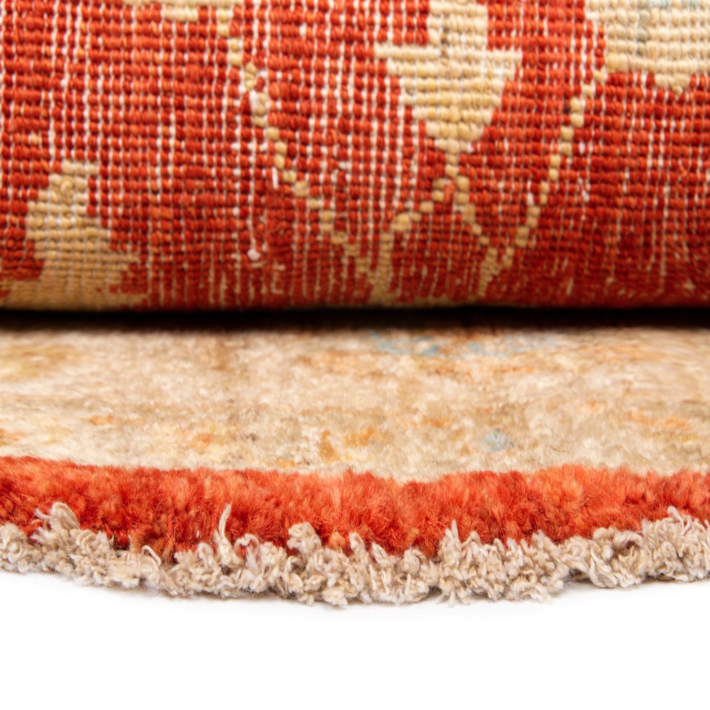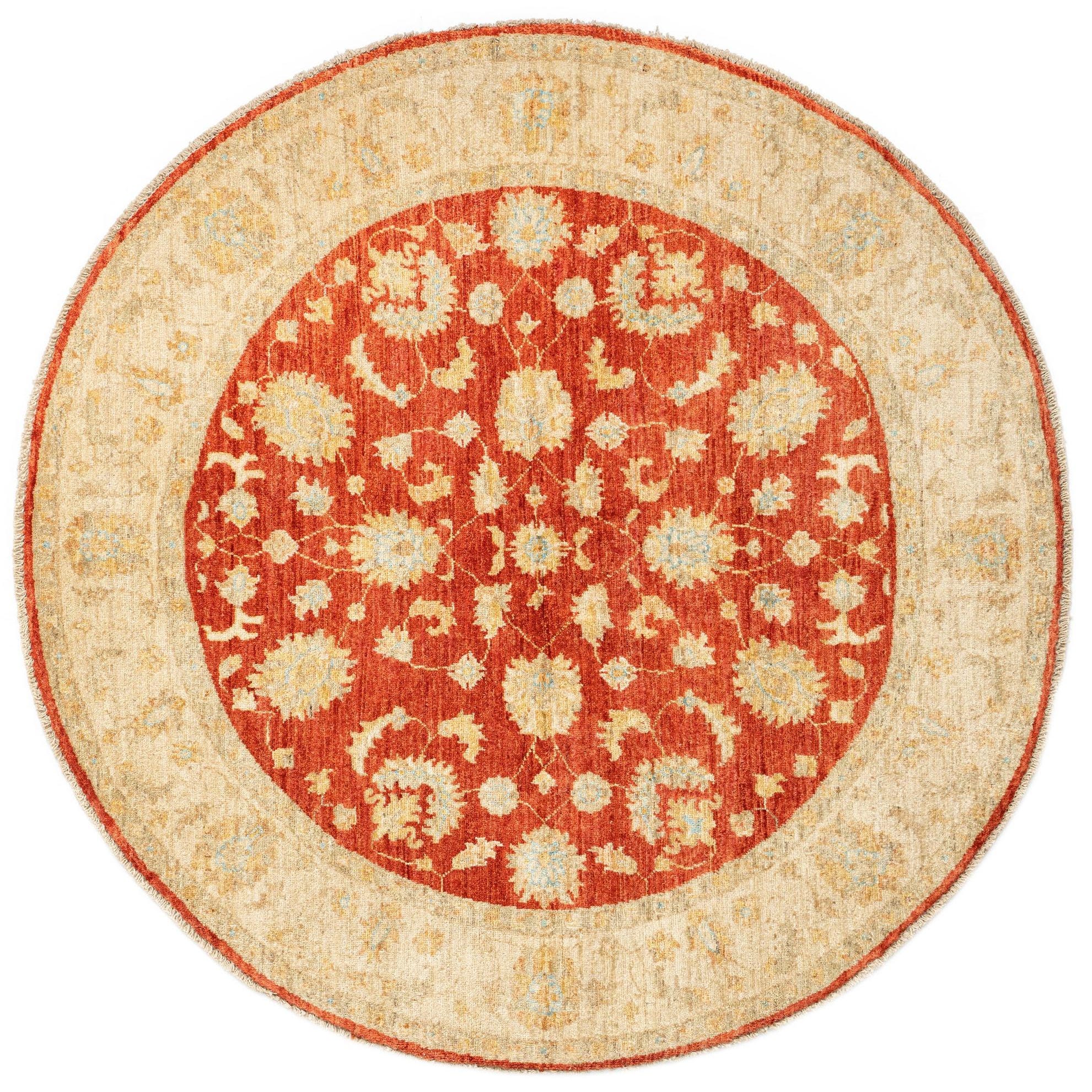 Hand made of 100% wool, this round rug presents a classic medallion motif with a warm beige background that frames a rich red central field. The pattern is made up of scrolling floral and palmette elements in beige with subtle turquoise accents that lift the palette. Running your hand across the surface reveals a soft, slightly dense wool pile with gentle variations in tone and texture that give the piece a lived-in, layered look.