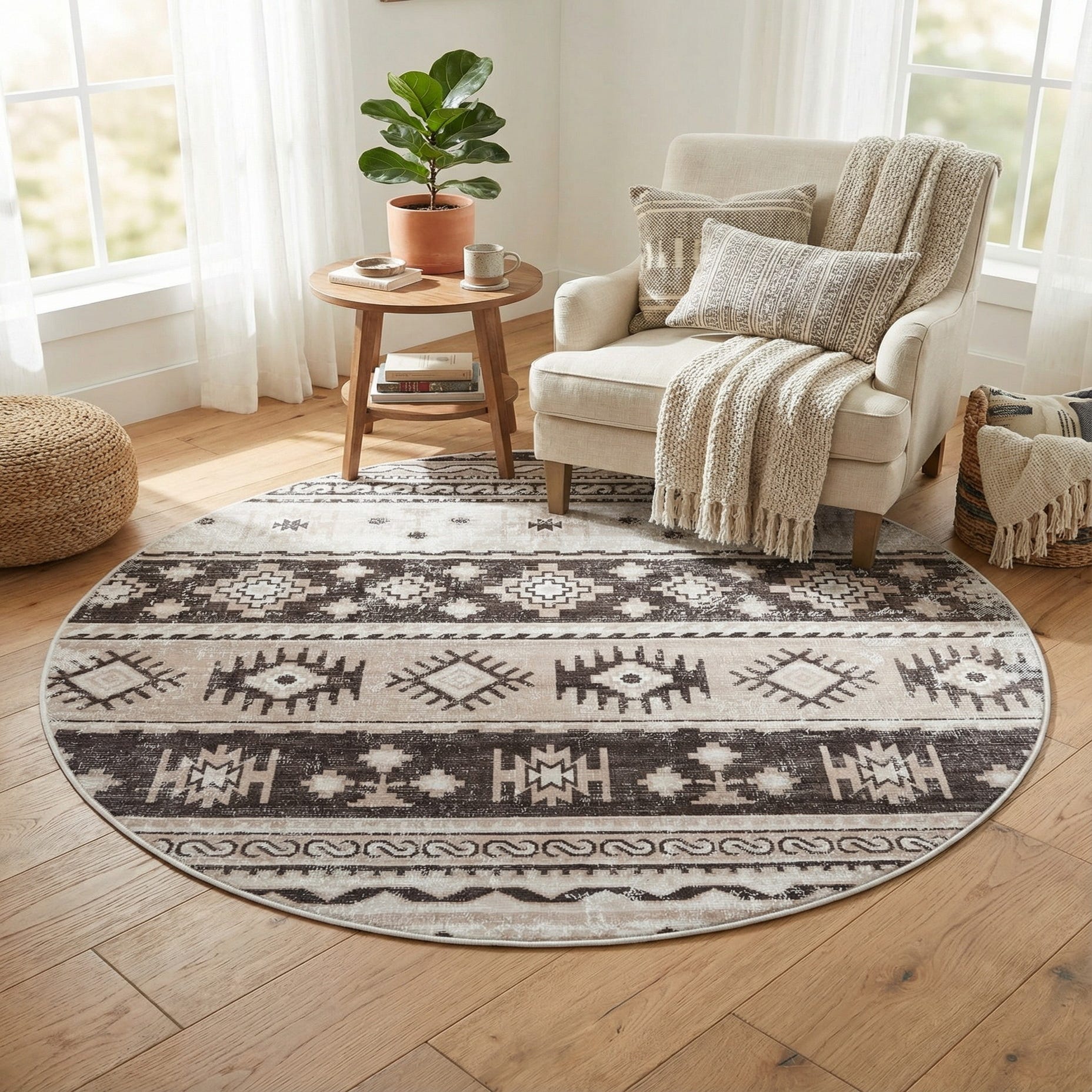 Layered horizontal bands of geometric and tribal-inspired motifs give this round rug a calm, structured presence. The beige background provides a warm neutral field while ivory highlights and deep brown accents define medallions, stepped shapes and linear borders. A subtle distressed finish softens the pattern, creating a lived-in look that still reads as intentional and orderly.