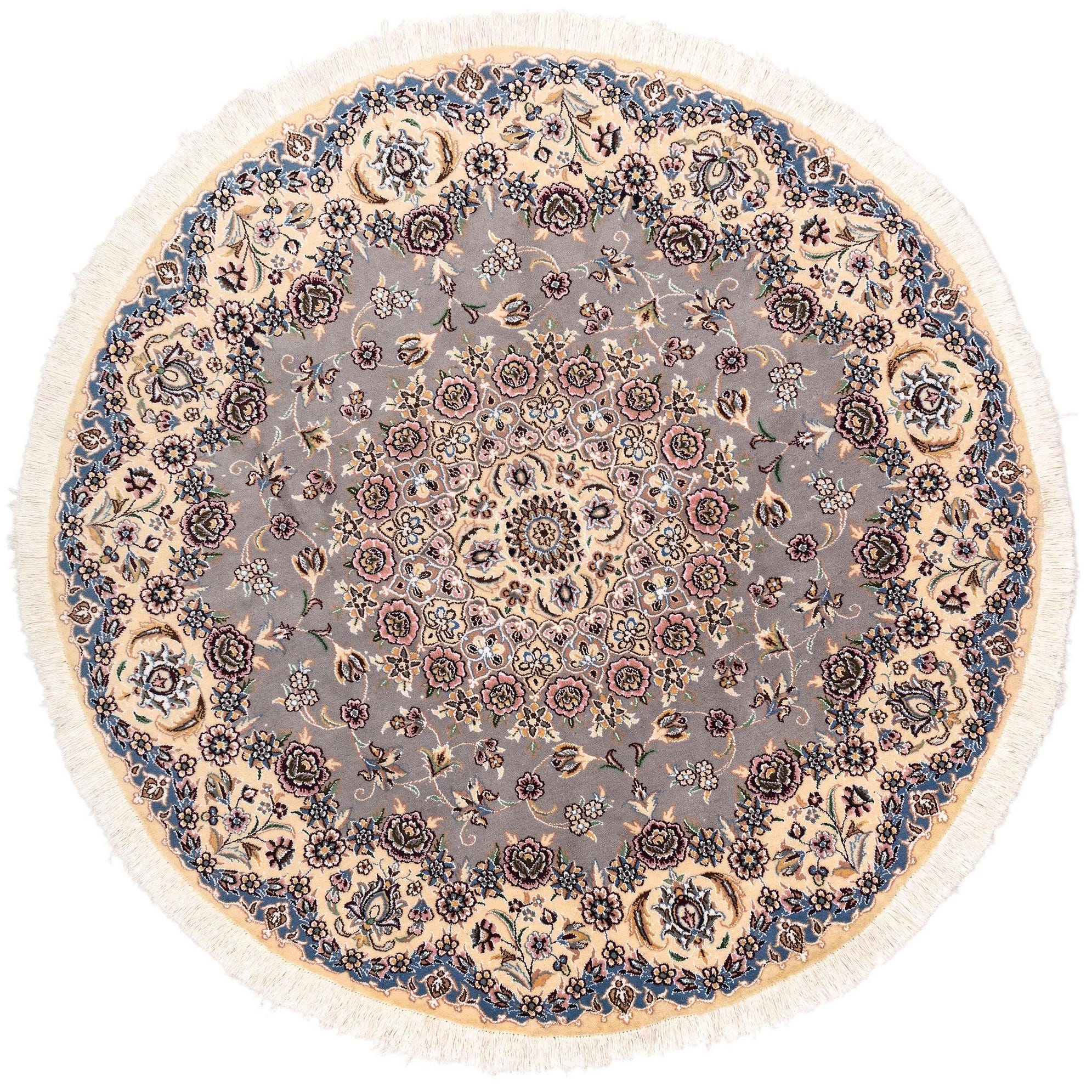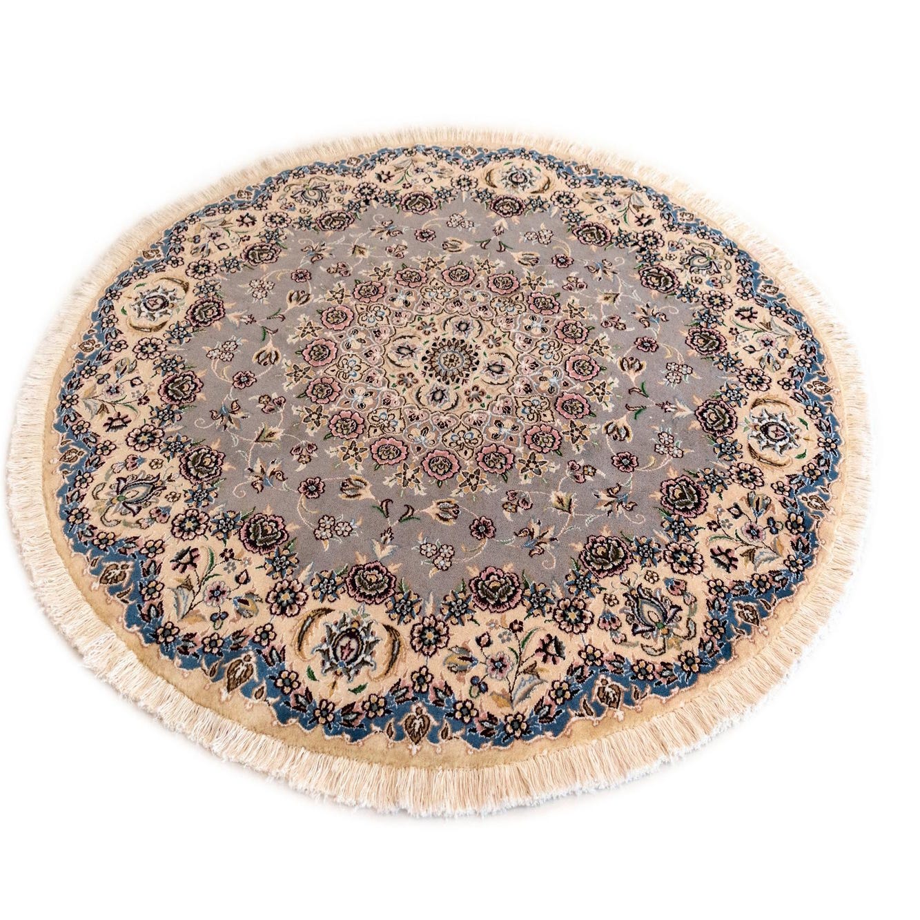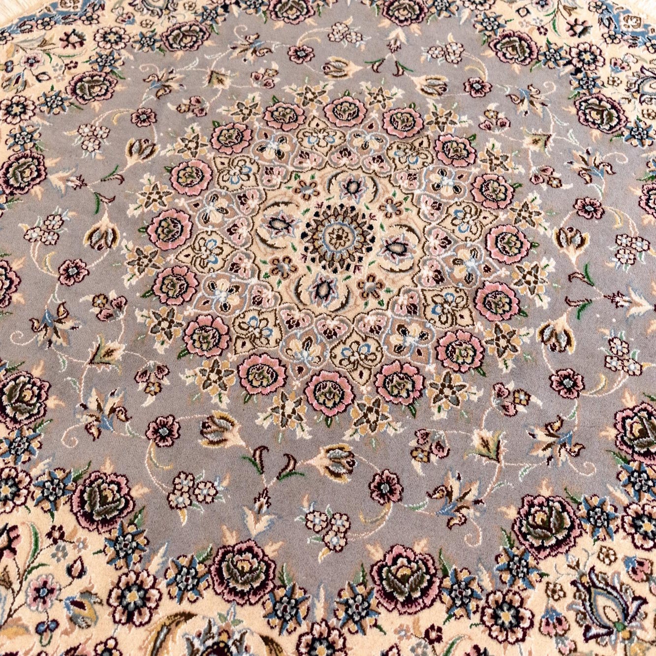 A round 4' 11 x 4' 11 Persian rug with a gray center, intricate floral patterns in pinks and blues, and a cream border with fringe.