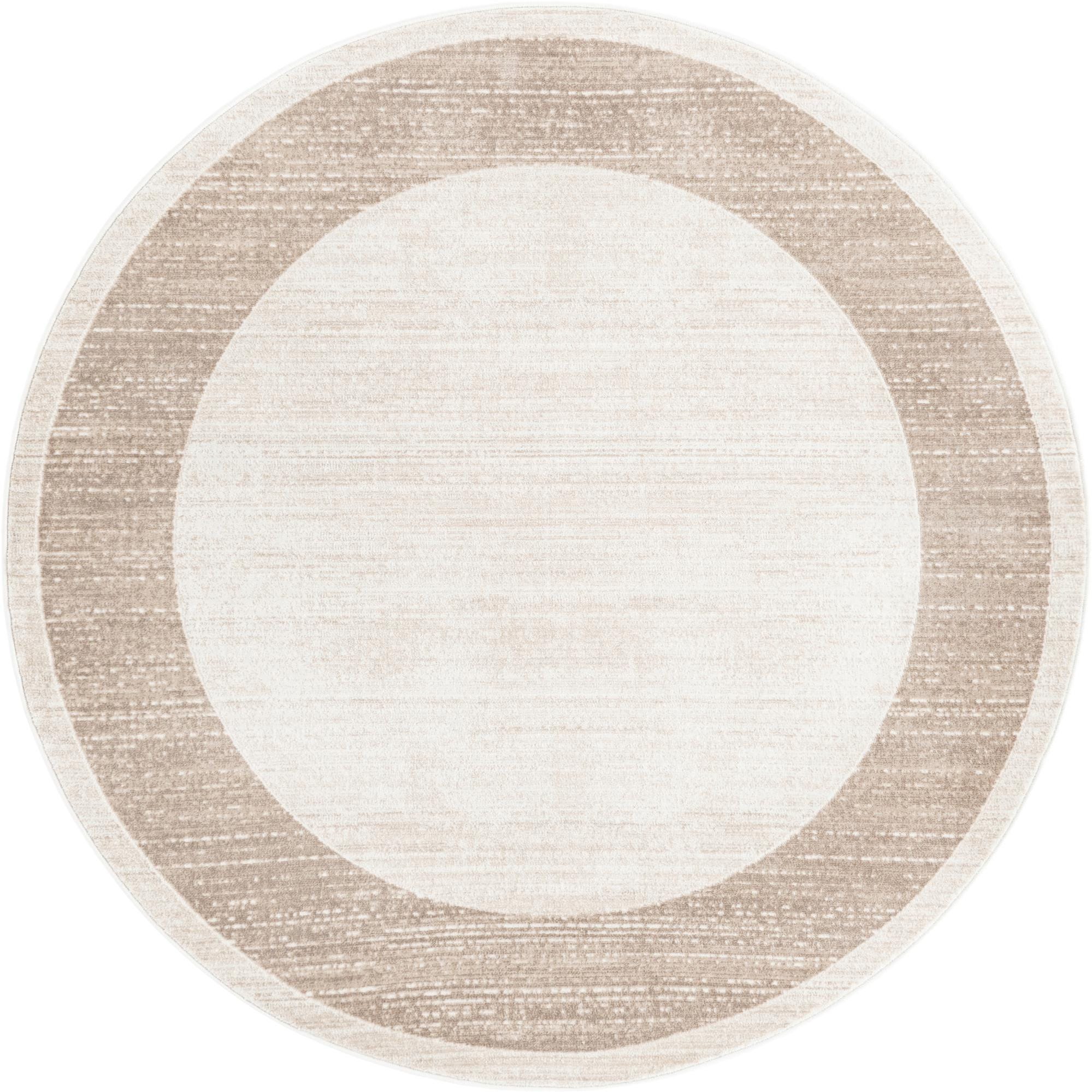 The Uptown collection presents a tastefully crafted 5 Ft Round rug, machine woven from a harmonious blend of 70% polypropylene and 30% polyester, ensuring durability with a soft hand. Its minimalist design features a concentric circle pattern with a smooth transition between its beige background and the subtle interplay of cream and light brown hues. The texture provides a comfortable underfoot feel that complements its sleek aesthetic.