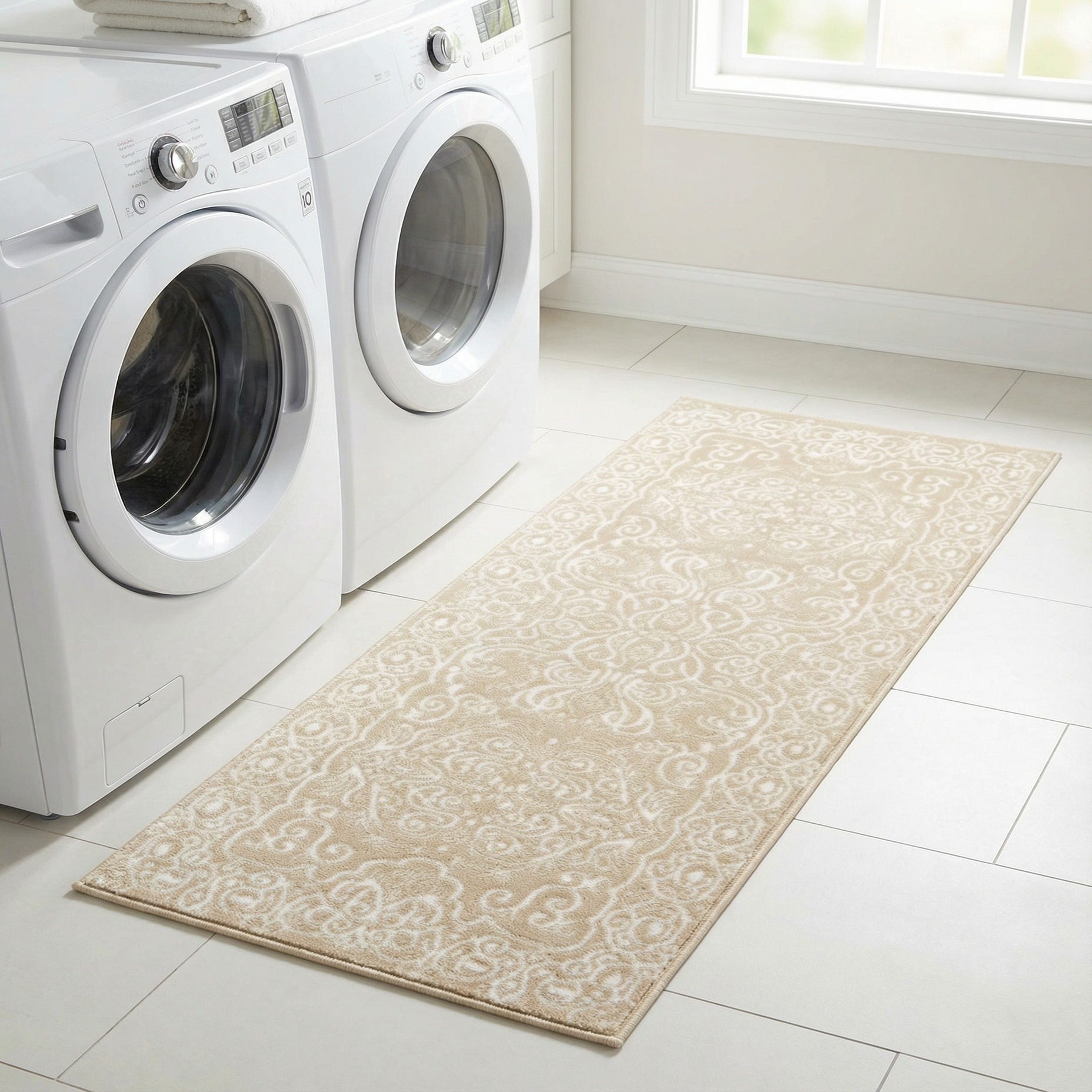 A refined, ornamental medallion and scrolling-border pattern is worked in ivory against a warm beige background, giving the runner a calm, traditional presence. The two-tone design is created with a subtle high-low effect: the ivory motif is slightly raised from the beige field, offering a soft, velvety hand underfoot. Machine-made from 55% polypropylene and 45% polyester, the construction delivers a consistent surface and a gentle pile that feels comfortable without overwhelming narrow spaces.