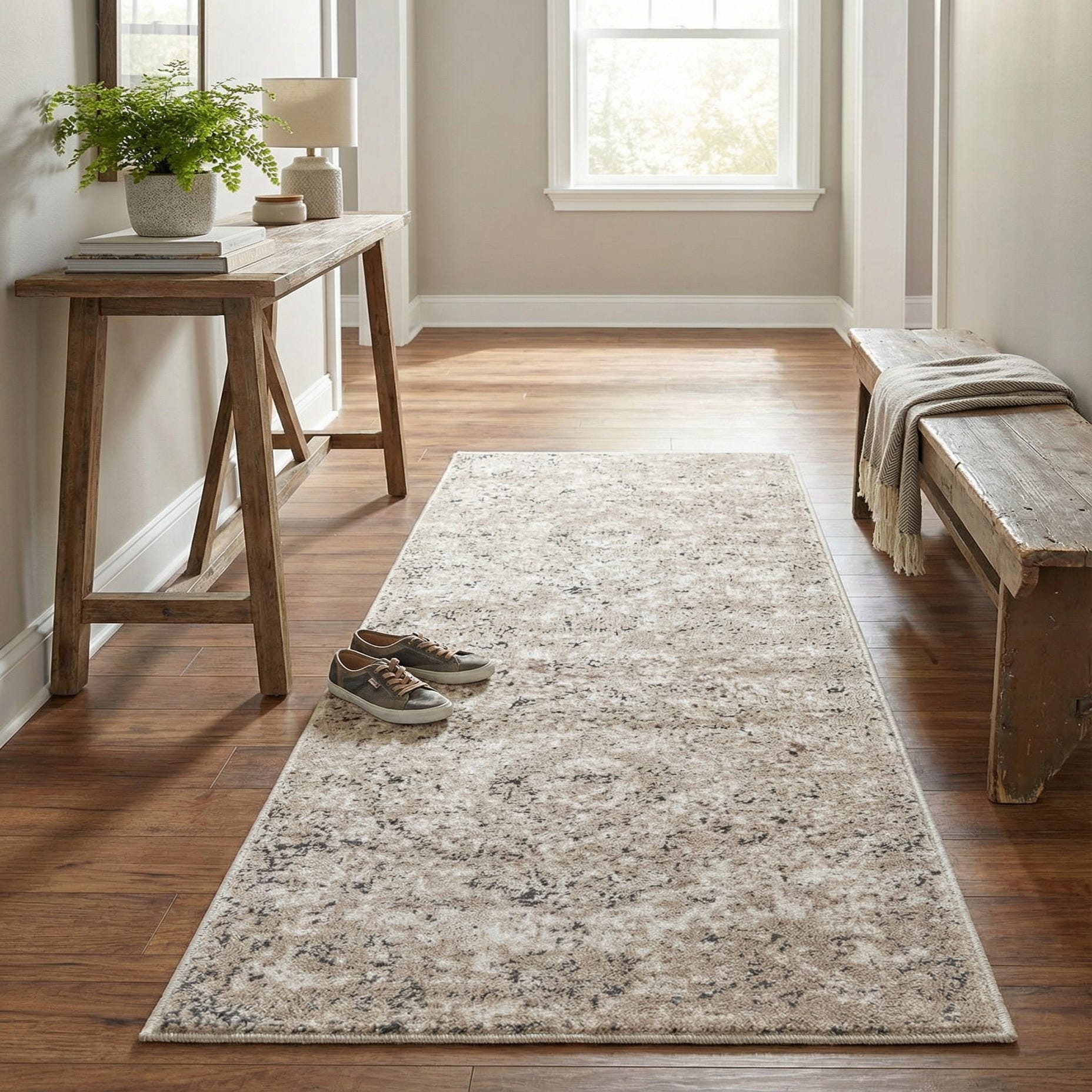 This runner works well in hallways, entryways or alongside a kitchen aisle to add quiet texture and warmth. It complements neutral, Scandinavian, modern farmhouse or contemporary schemes and pairs nicely with light wood floors, matte black or warm brass accents, and simple patterned textiles. Use it to ground a narrow space or layer it under a console table to introduce understated pattern and tactile comfort.