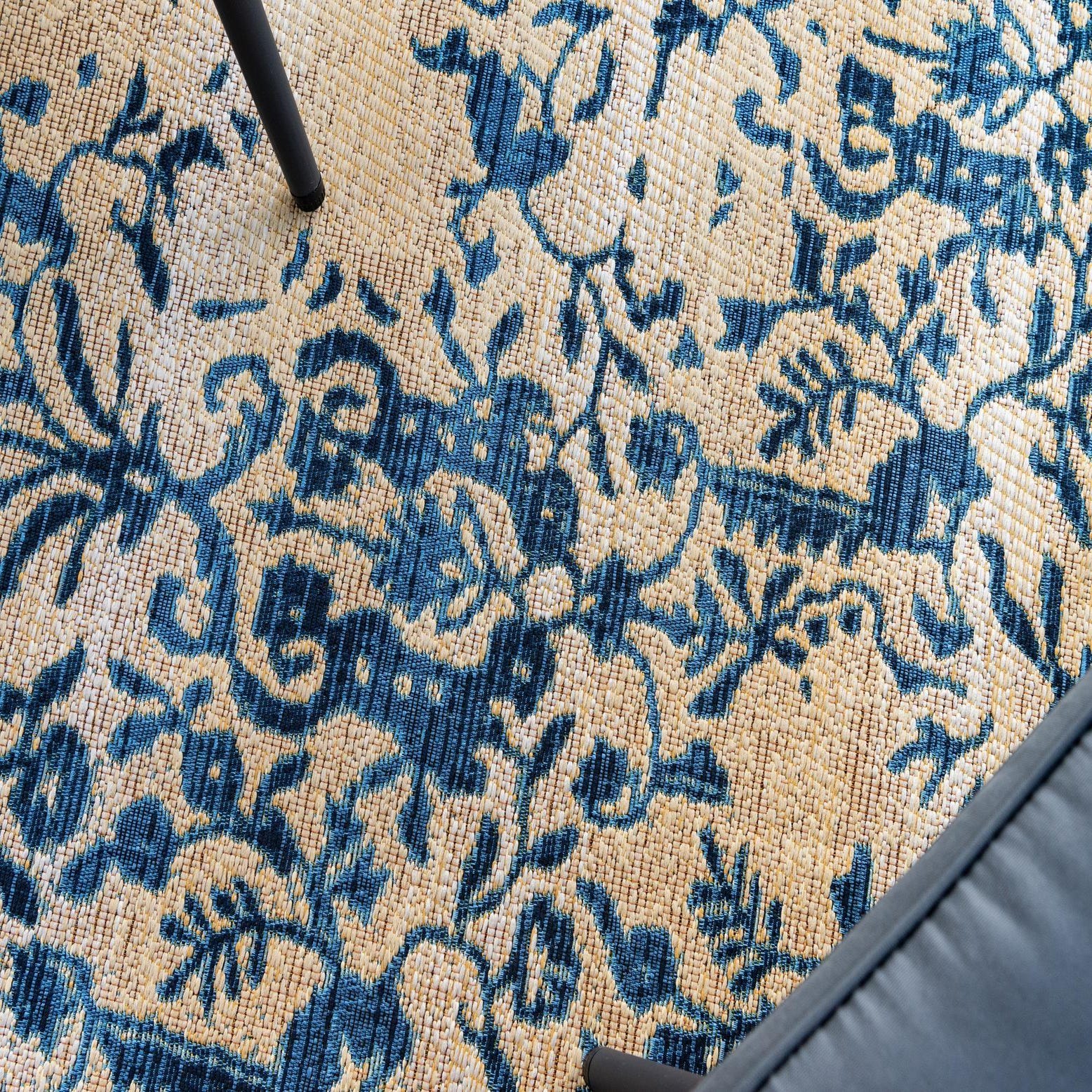 This runner is well suited to hallways, narrow entries, and covered outdoor living areas or sunrooms where pattern can define a path without overpowering the space. Pair it with natural woods and woven seating for a casual, layered look, or coordinate with navy or gray upholstery to pick up the cooler accents. Its relaxed botanical motif fits coastal, cottage, and transitional interiors that benefit from a soft patterned layer.