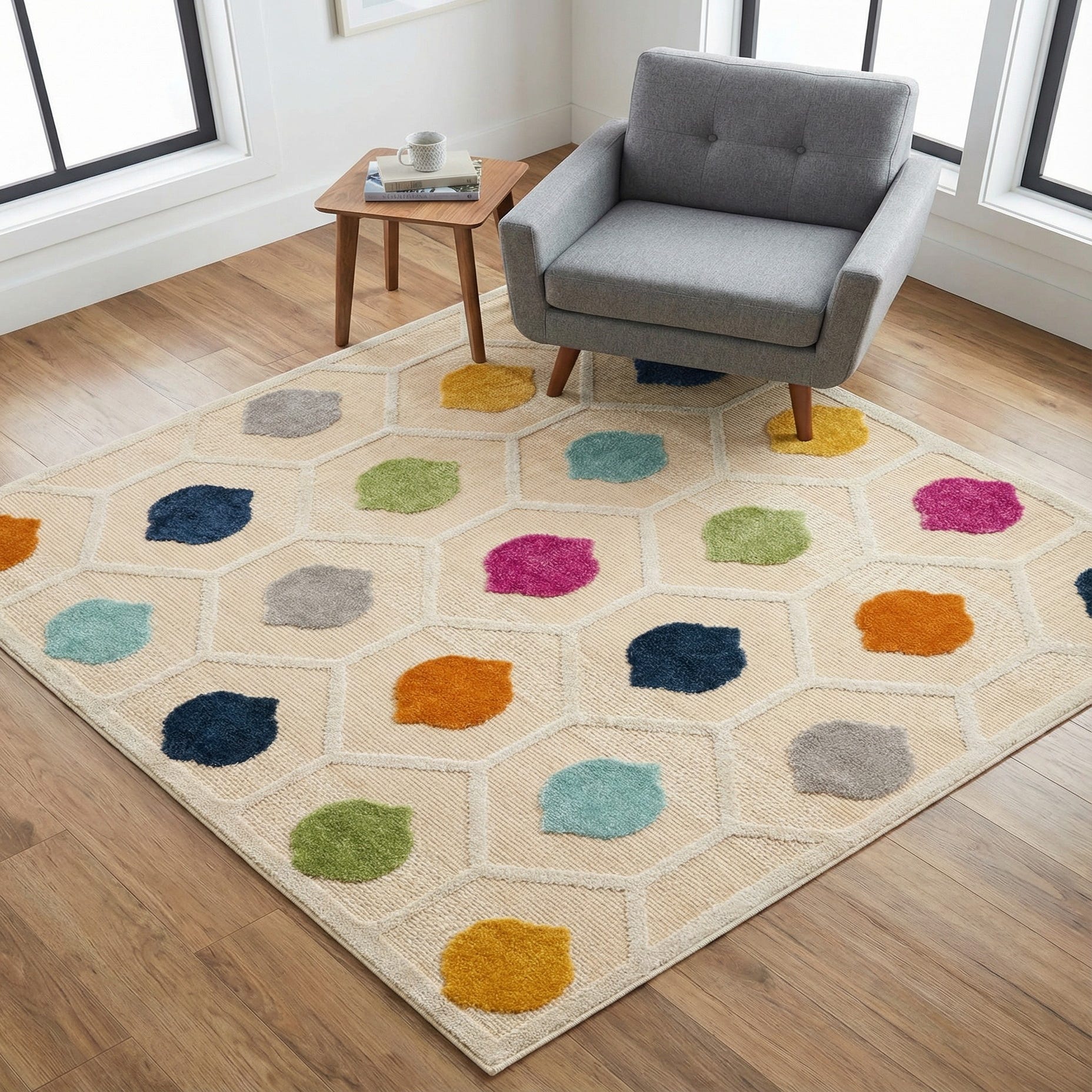 This rug's contemporary design with a subtle nod to mid-century aesthetics would be a perfect fit in modern living rooms, playrooms, or vibrant outdoor spaces such as patios or decks. Its array of colors can easily tie together eclectic furniture pieces, adding a touch of whimsy without overwhelming the surrounding decor. The versatility of the Aruba Outdoor rug allows it to serve as a statement piece in minimalist settings or blend harmoniously with more colorful schemes, making it ideal for a variety of home styles.