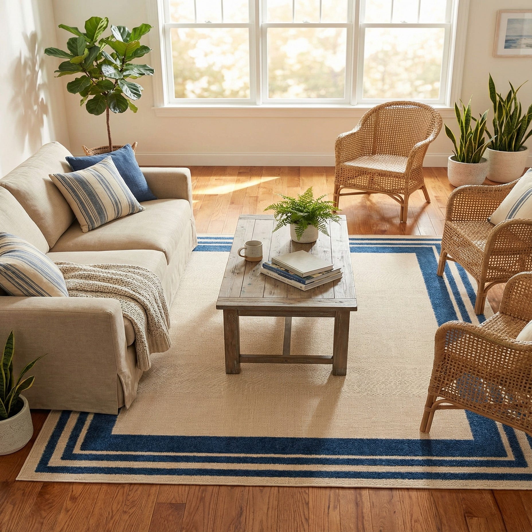 A 5'3" x 5'3" square Rugs.com Aruba Outdoor rug in cream with a bold navy blue border, ideal for a patio.
