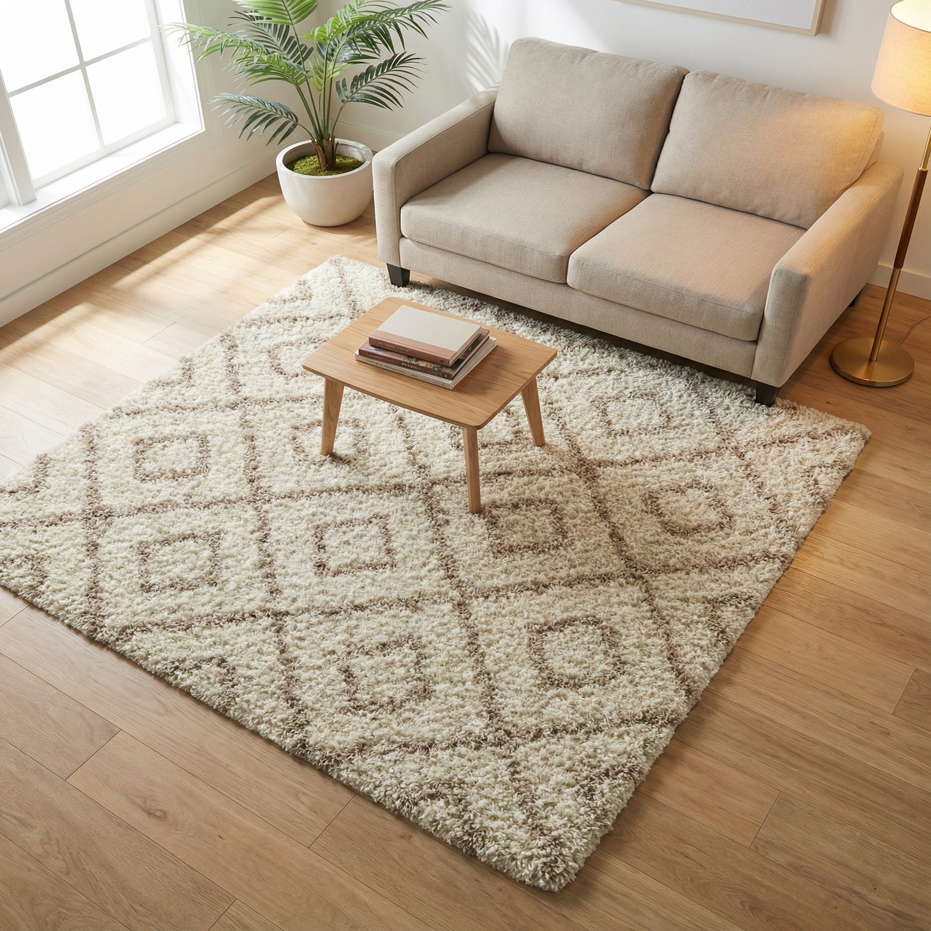 A plush shag pile in a warm beige background gives this machine-made rug a cozy, tactile presence. Light brown yarns form a repeating diamond lattice that lifts slightly above the base pile, creating subtle depth and a soft, dimensional pattern you can feel underfoot. Constructed from 100% polypropylene, the fibers have a gentle sheen and a dense, springy texture that invites bare feet and adds a layered, comfortable look to the floor.