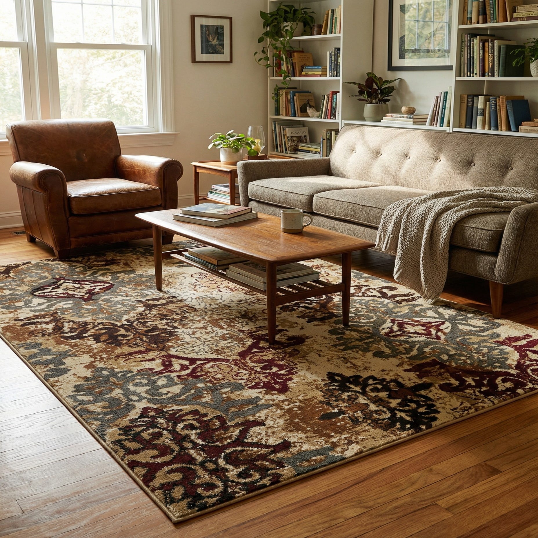 Machine-made from 100% polypropylene, the rug has a low, dense pile with a slightly cushioned hand that sits comfortably underfoot and tucks neatly beneath sofas, tables, or a bedroom bed. Place it beneath a neutral linen sofa and walnut coffee table for a relaxed living area, layer it in a casual dining room with leather or upholstered chairs, or use it to warm an entryway or home office paired with navy, olive, or burgundy accents and natural wood finishes.