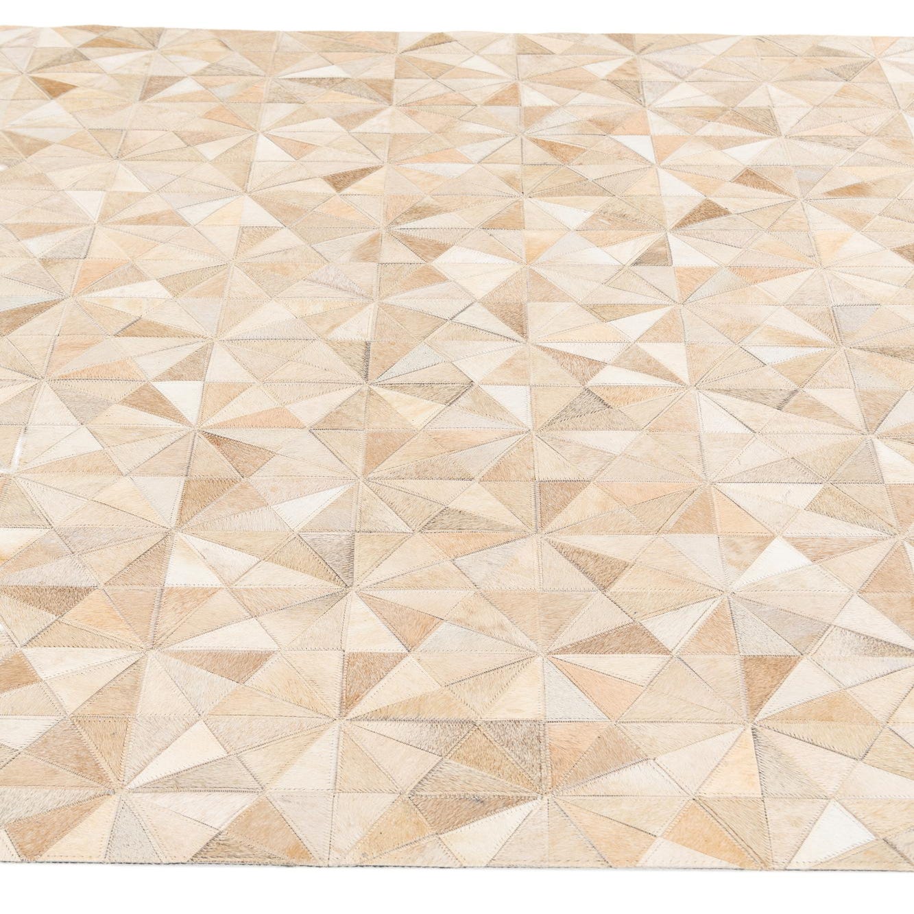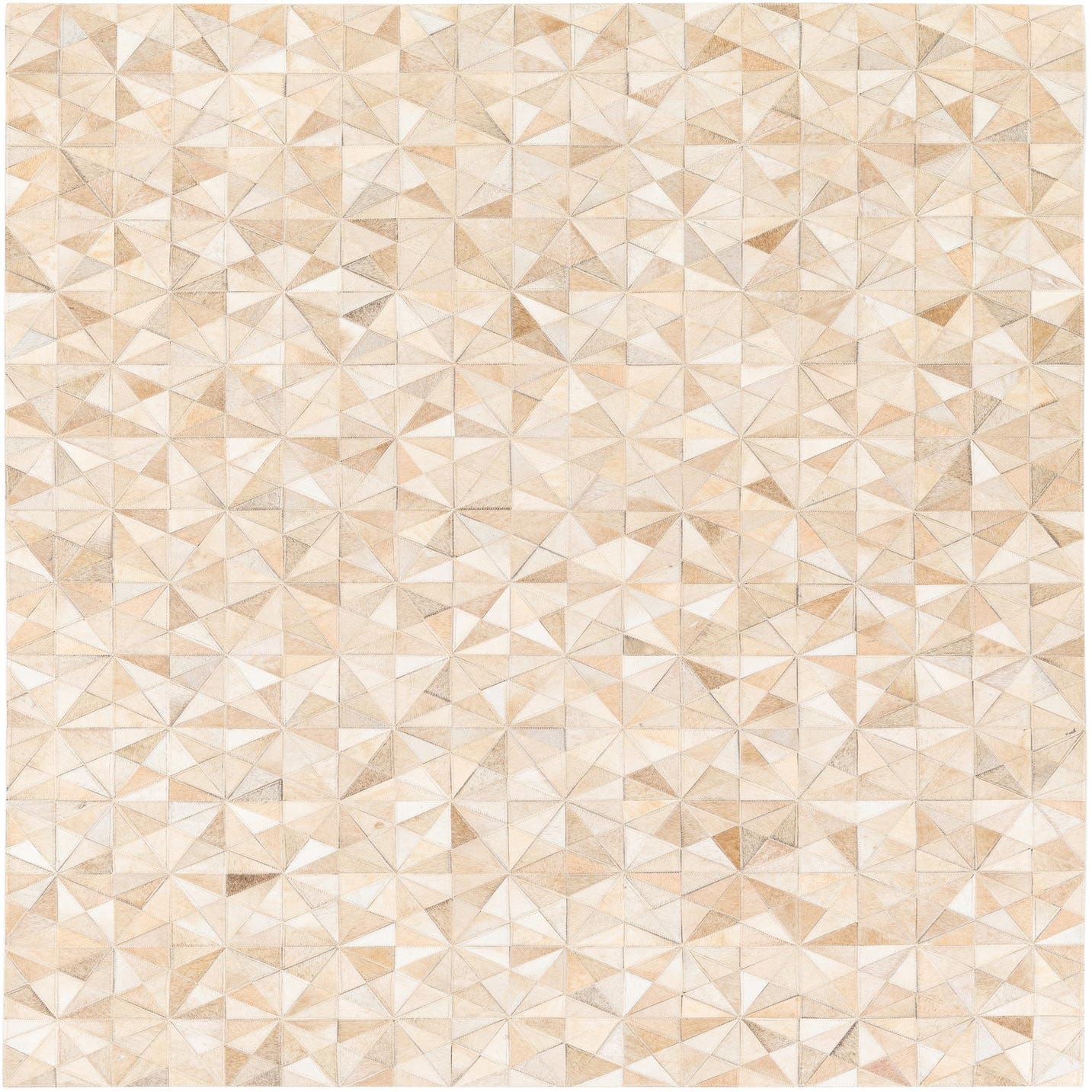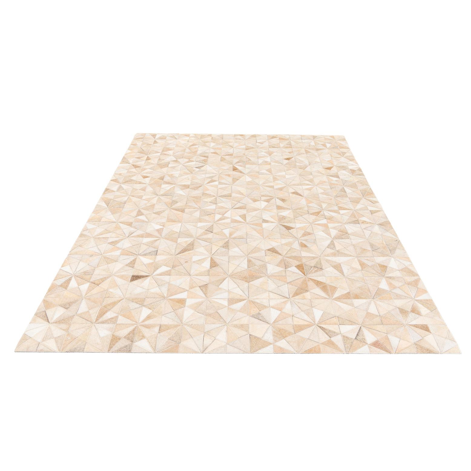 A 5x7 rectangular Cowhide Stocks rug featuring a modern geometric pattern in various shades of brown, tan, and cream.