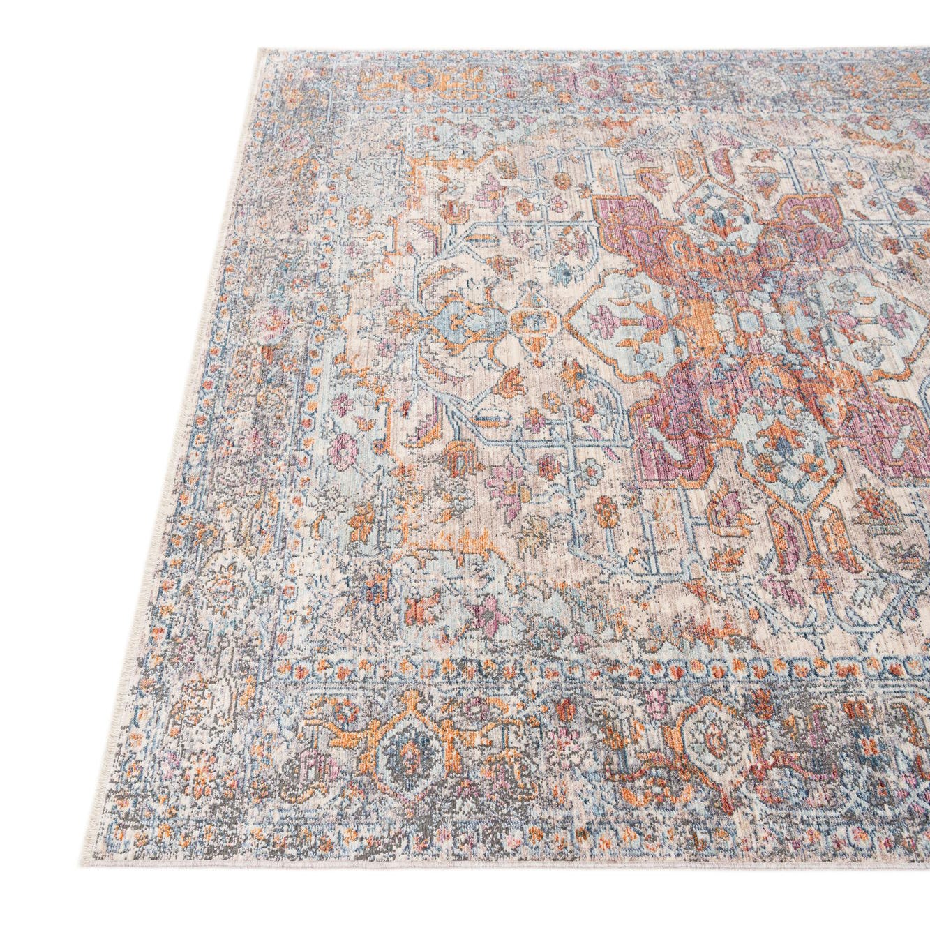 Primary color is Beige. Colors in this rug include: Beige, Blue, Brown, Light Blue, Orange, Pink, Gray.