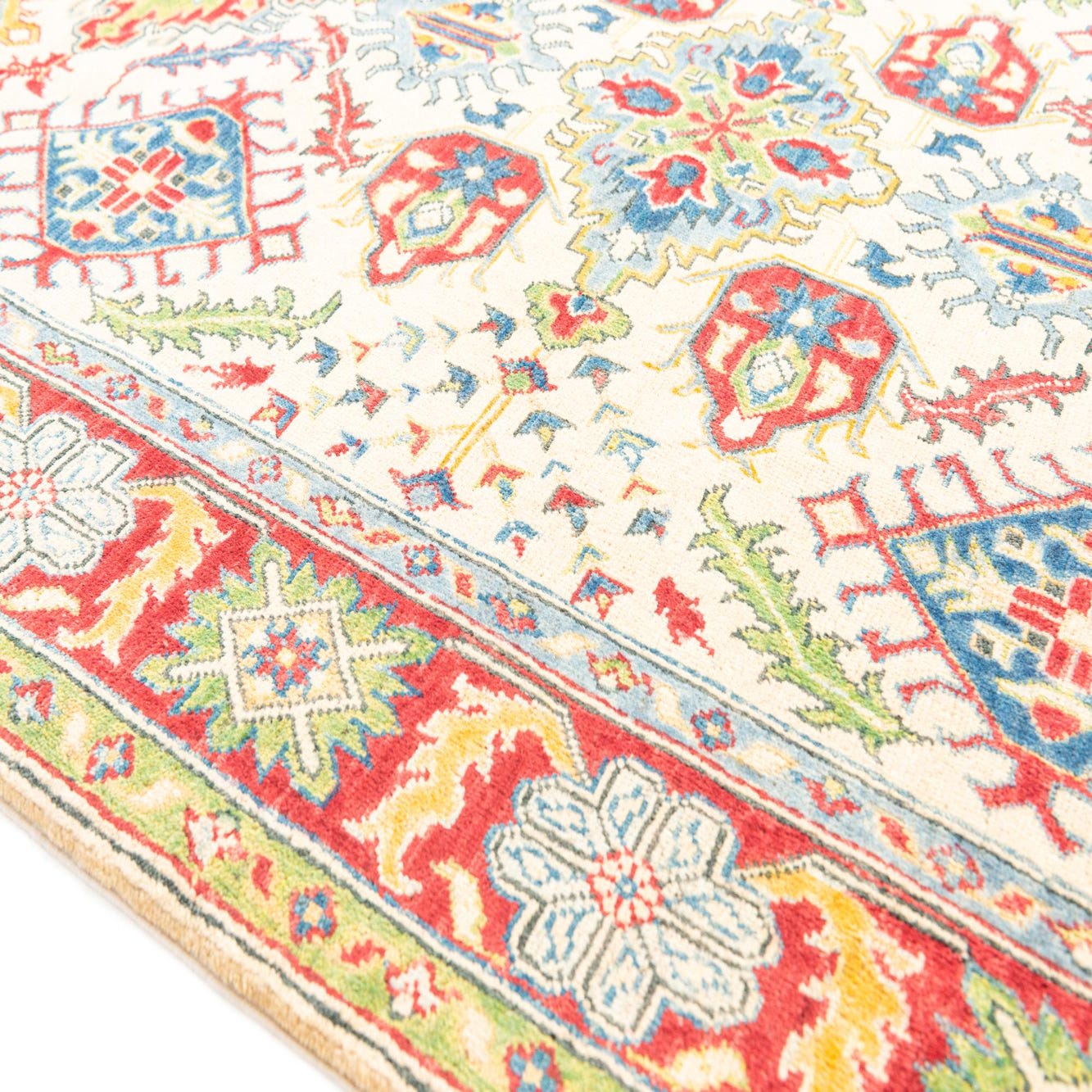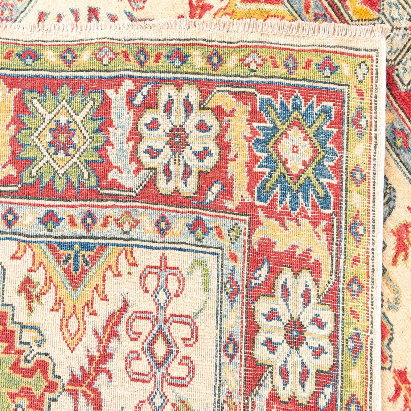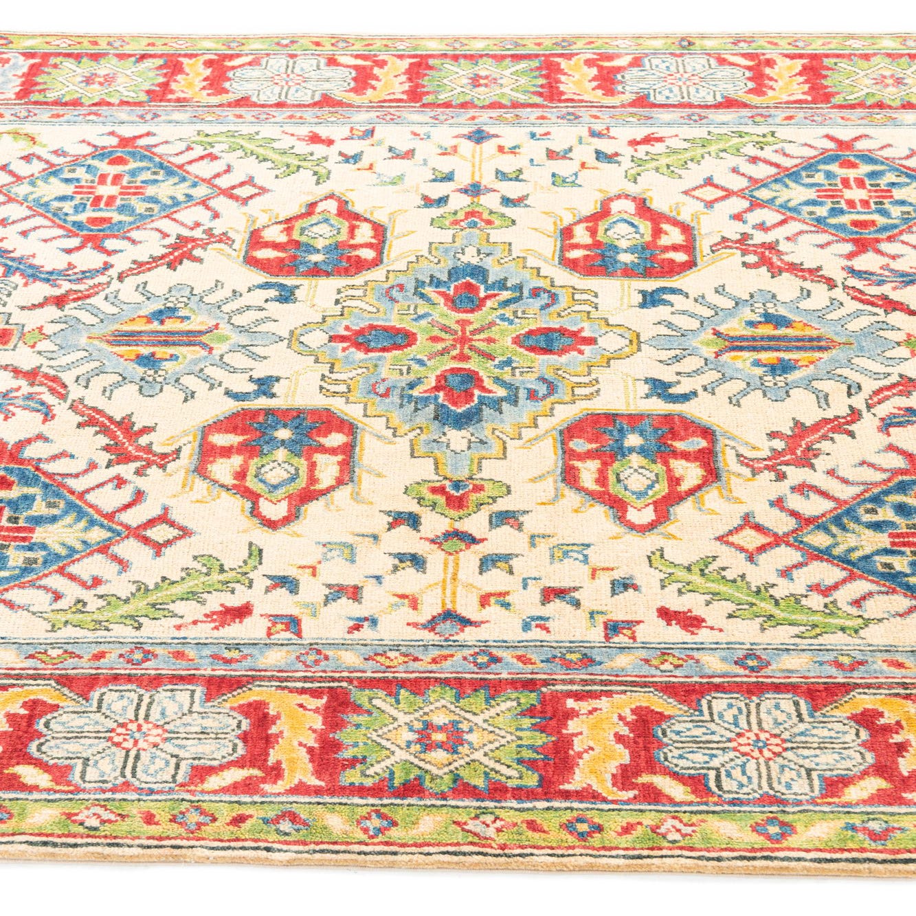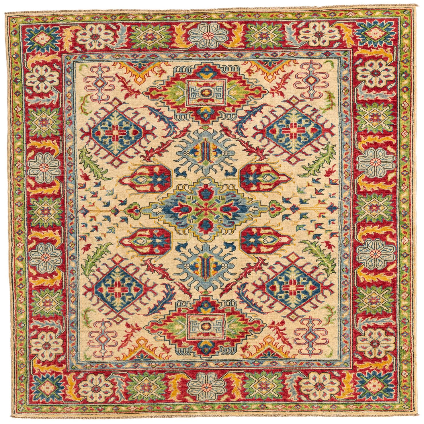 This Kazak collection rug is a hand-knotted piece, meticulously crafted from 100% hand-spun wool. Sized at 5x7 feet, it features a symmetrical pattern rich in cultural heritage. The beige background sets the stage for an intricate display of geometric motifs and stylized floral elements, accented with a vibrant palette that includes shades of blue, red, navy blue, light blue, brown, and yellow. The rug presents a harmonious balance of color and design, with bold, angular lines that speak to its traditional roots.