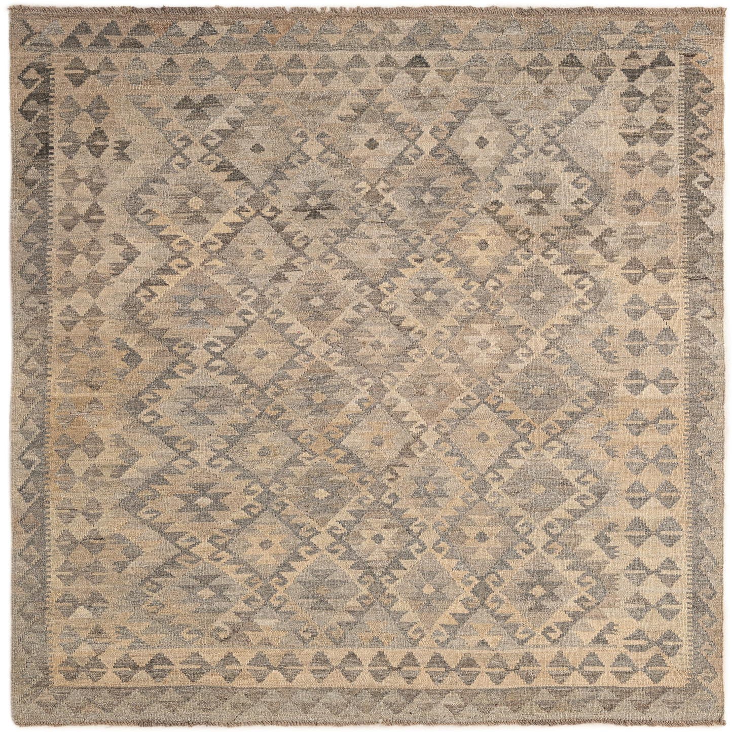 A 5x7 rectangular Kilim Maymana rug with a tribal geometric pattern in shades of brown, tan, and cream.