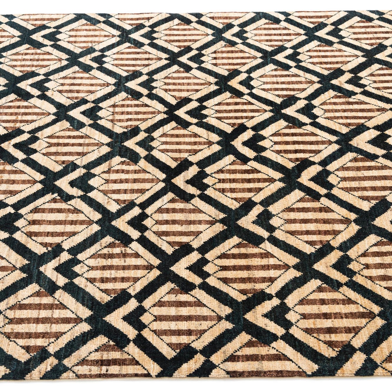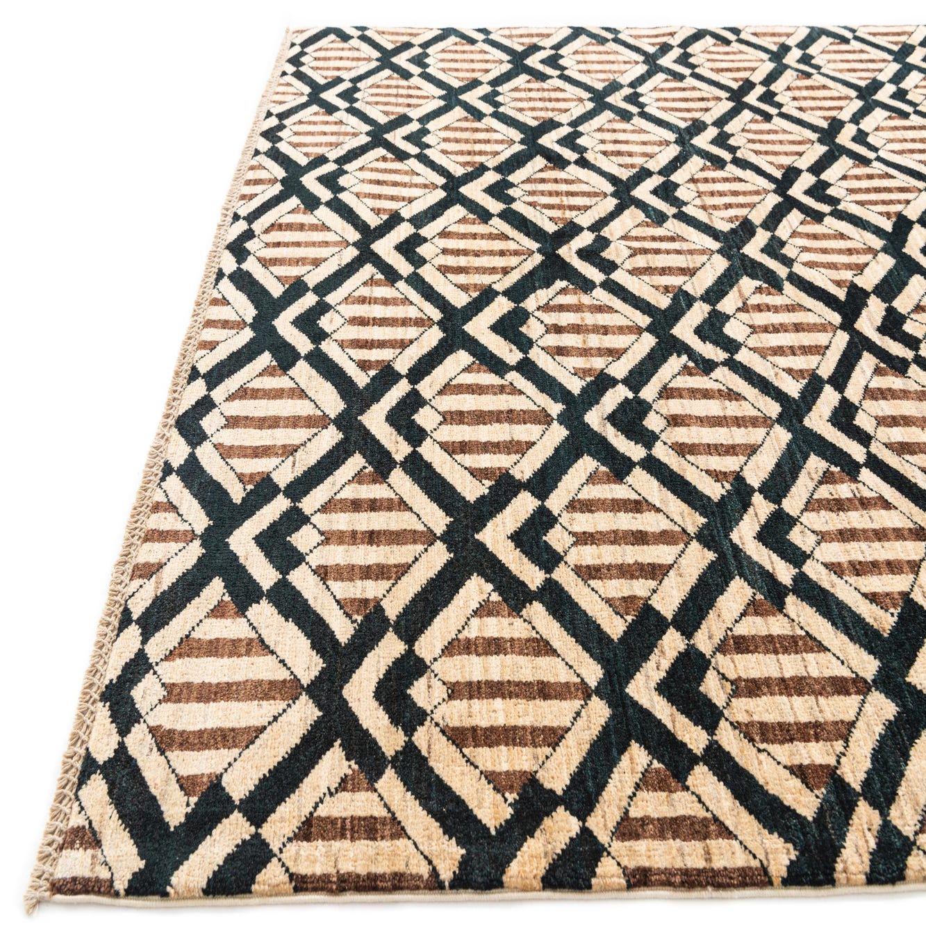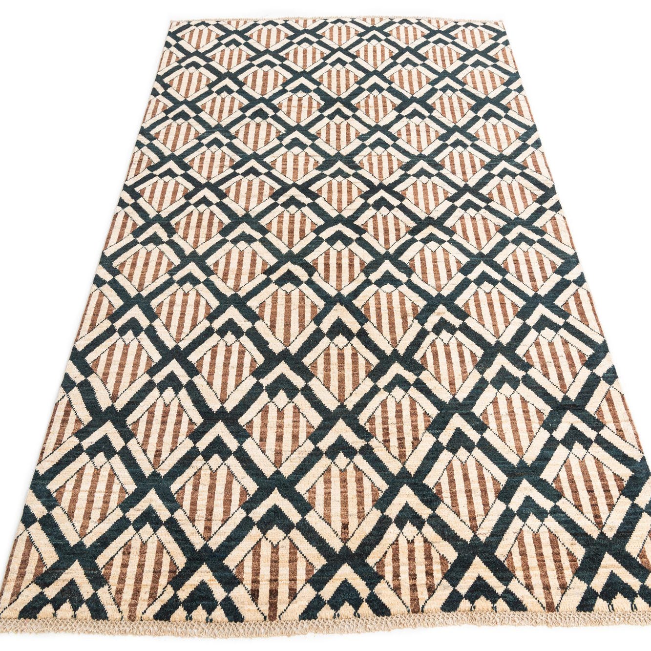 A 5x7 rectangular Modern Ziegler rug featuring a geometric pattern of brown stripes within ivory diamonds, framed by dark brown V-shapes.