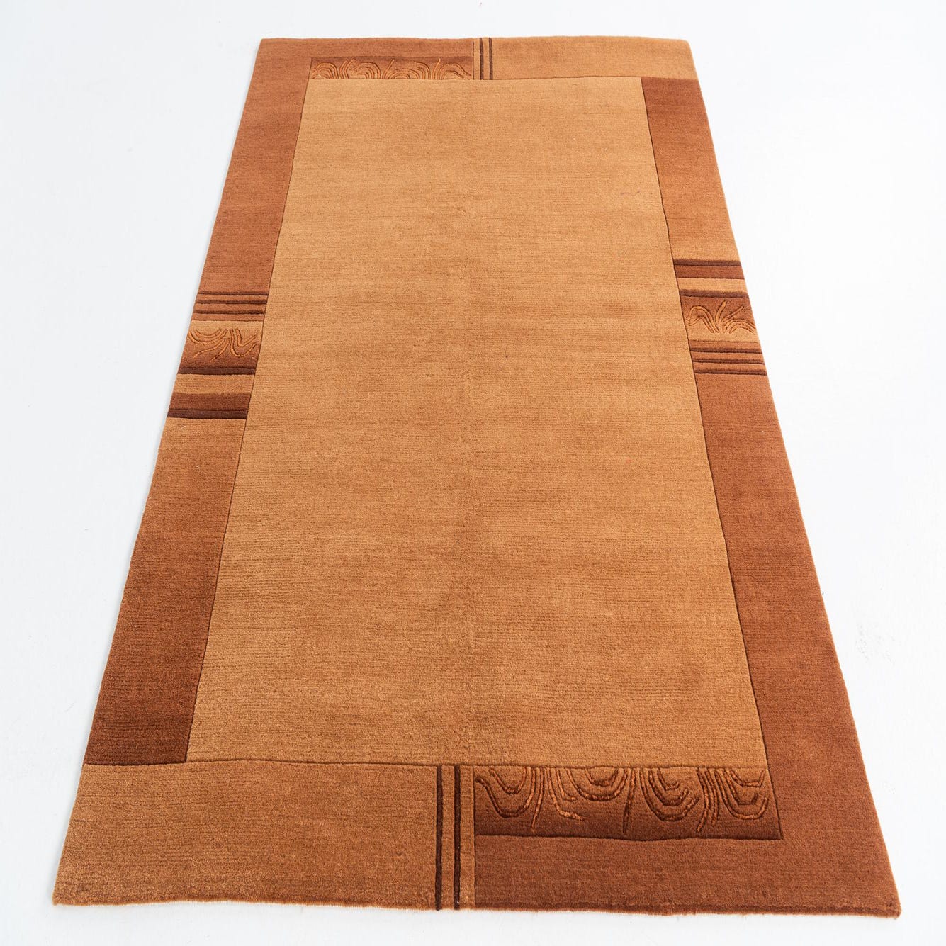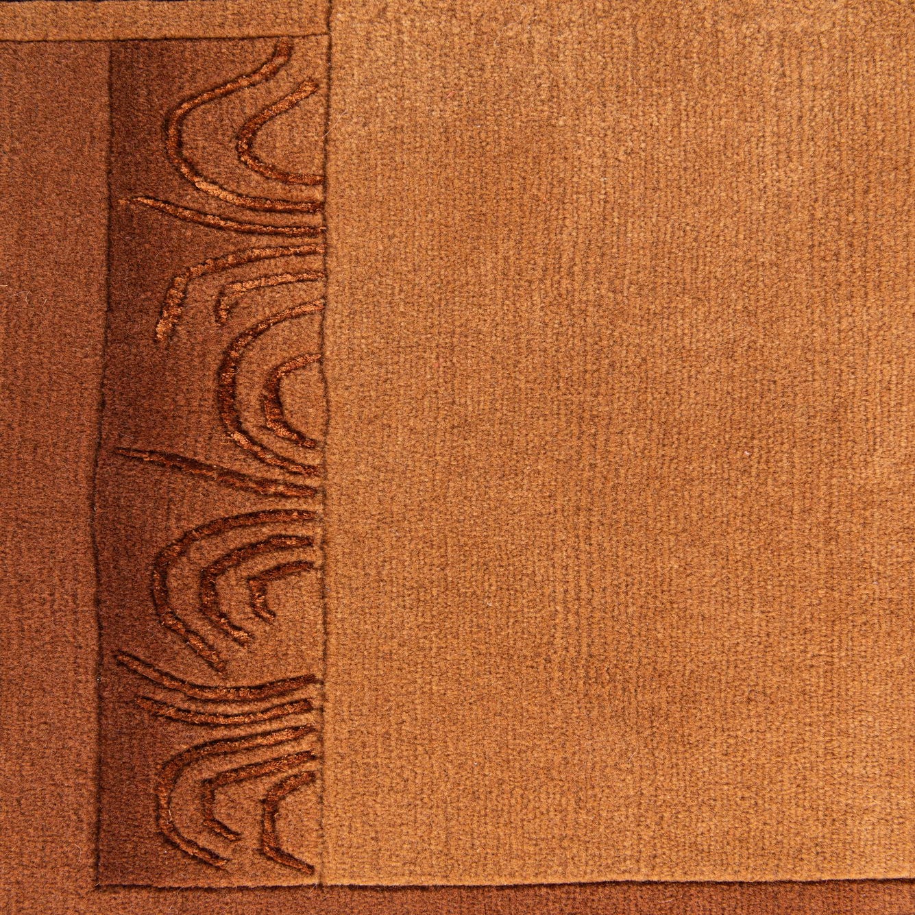 The texture of this rug is sumptuous due to the combination of wool and silk fibers, which together provide a plush pile that is pleasing to touch. The differing shades of brown create a sense of depth and dimension, while maintaining a cohesive color scheme that is versatile and appealing.