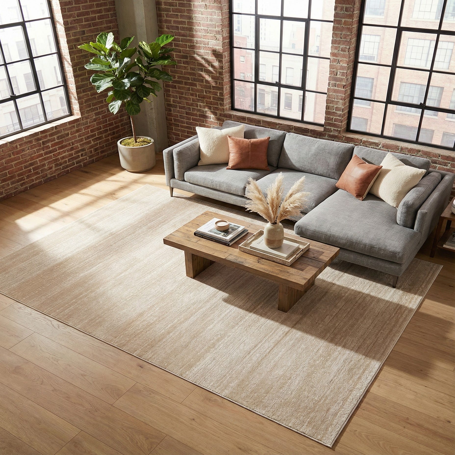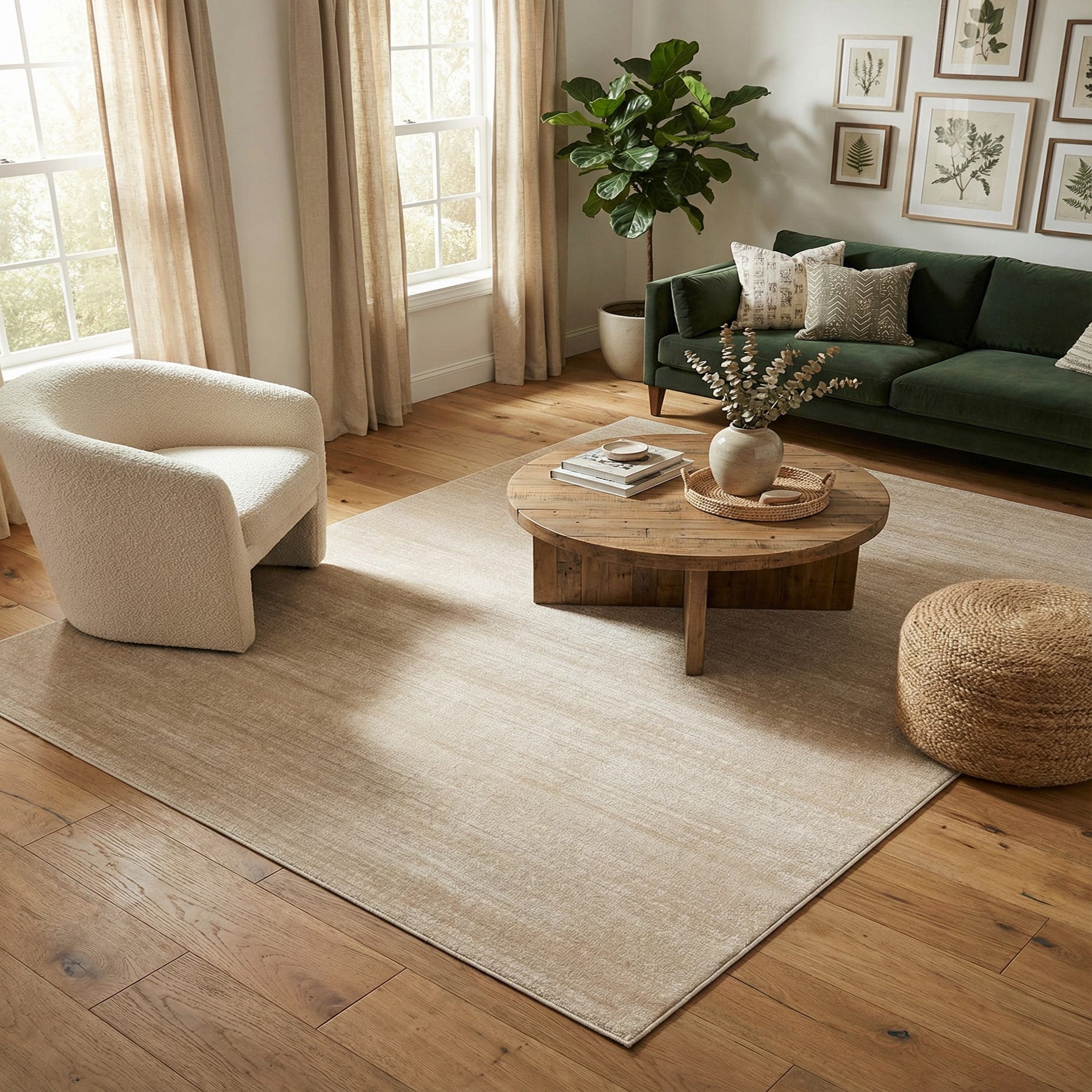This rug pairs naturally with warm wood tones and neutral upholstery, anchoring a living room seating group or layering under a bed for a calm, cohesive look. It also complements minimalist, Scandinavian, or transitional interiors and can soften a modern office or dining area while maintaining a clean, understated aesthetic.