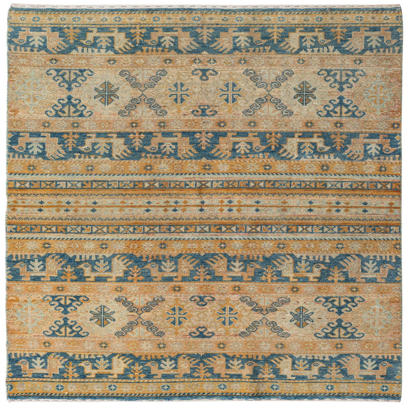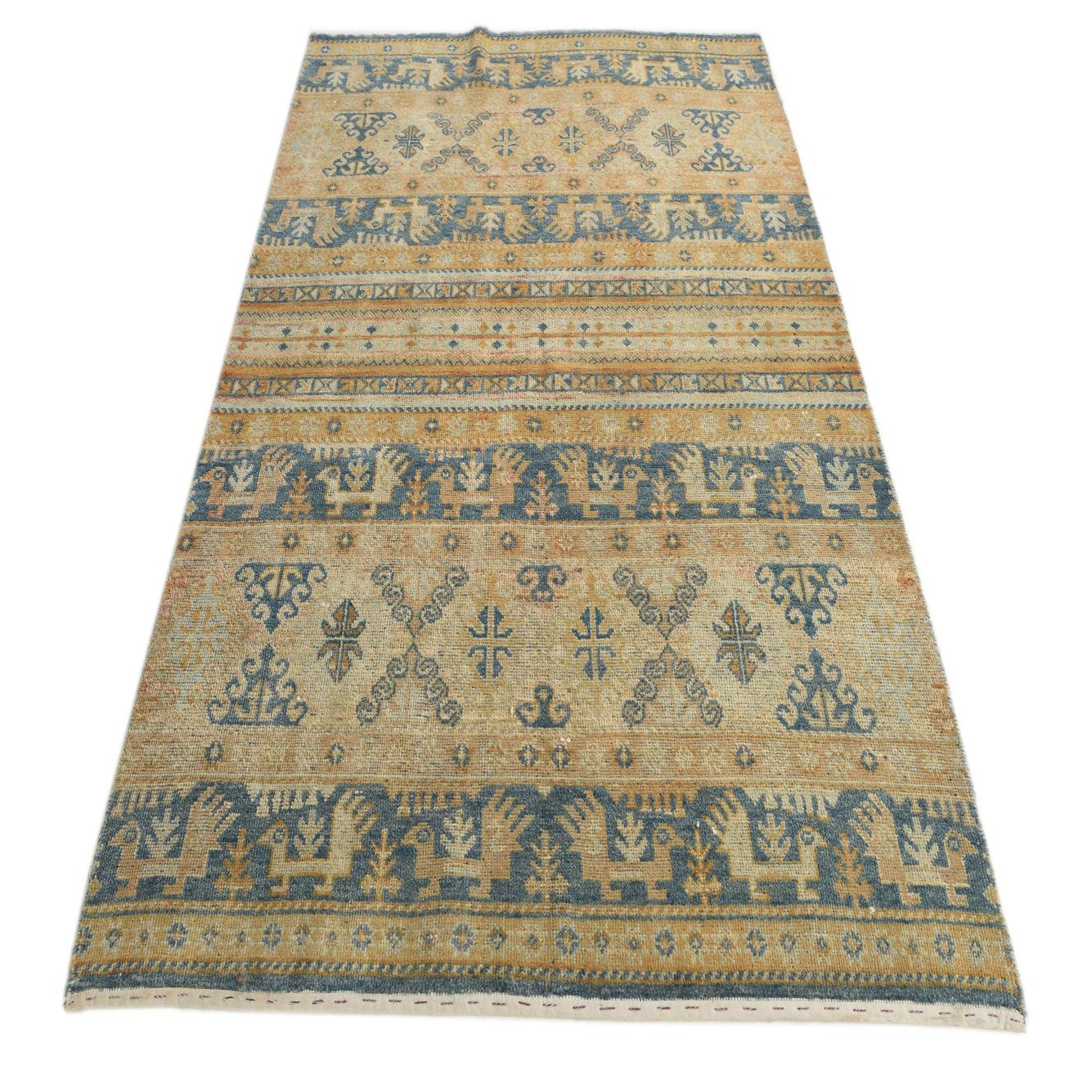 A hand-knotted rug crafted from 100% hand-spun wool, this piece presents a low- to medium-profile pile with a gently textured, tactile surface that invites bare feet. A beige field serves as the backdrop for banded, tribal-inspired motifs rendered in blue, gold, olive, ivory, light green and light brown. Repeating geometric medallions, stylized foliate elements and small bird-like figures form horizontal registers across the weave, giving the rug a layered, timeworn look with clear pattern definition and soft color variation.