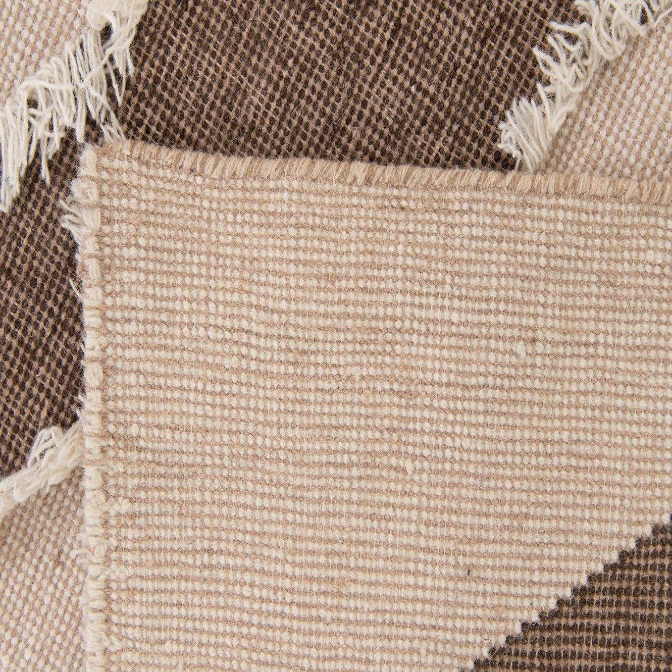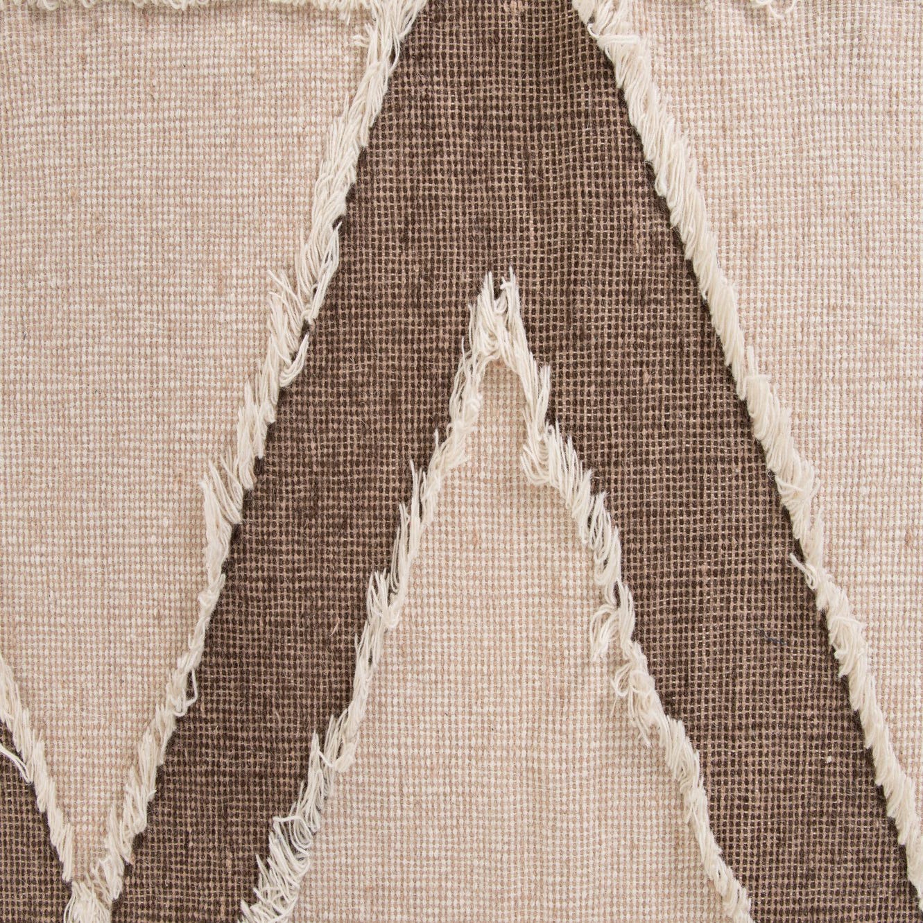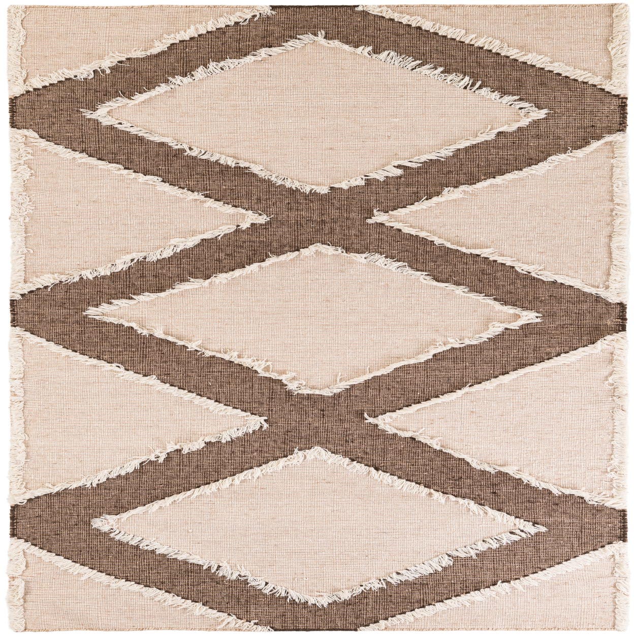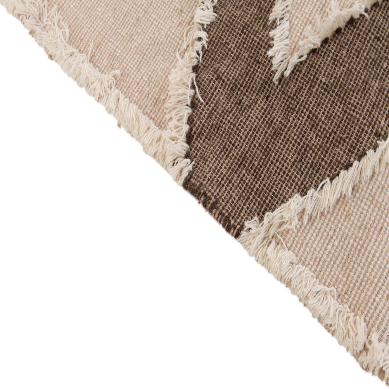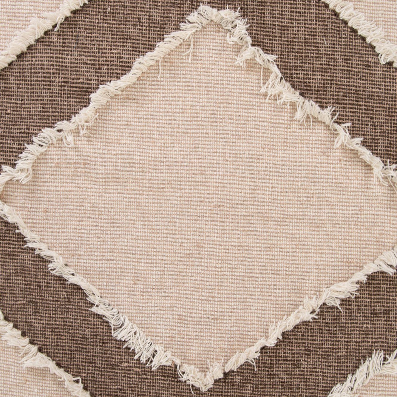 A warm beige field provides a calm, neutral backdrop for a bold, linear diamond motif in rich brown, each shape outlined with a band of ivory fringe. The design is built on a flat?woven wool ground with intentionally elevated, fringed tufting that gives the pattern a tactile, layered effect—soft underfoot where the wool pile meets the flatter weave and pleasantly textured along the fringe edges. Hand woven from 100% wool, this piece combines natural fiber warmth with clear geometric lines for an organic, crafted look.